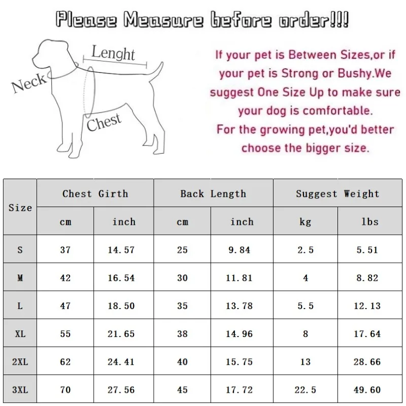 3XL: Pecho 70cm/27,56''; Longitud 45cm/17,72''; Peso sugerido 22,5 kg/49,6 lbs.