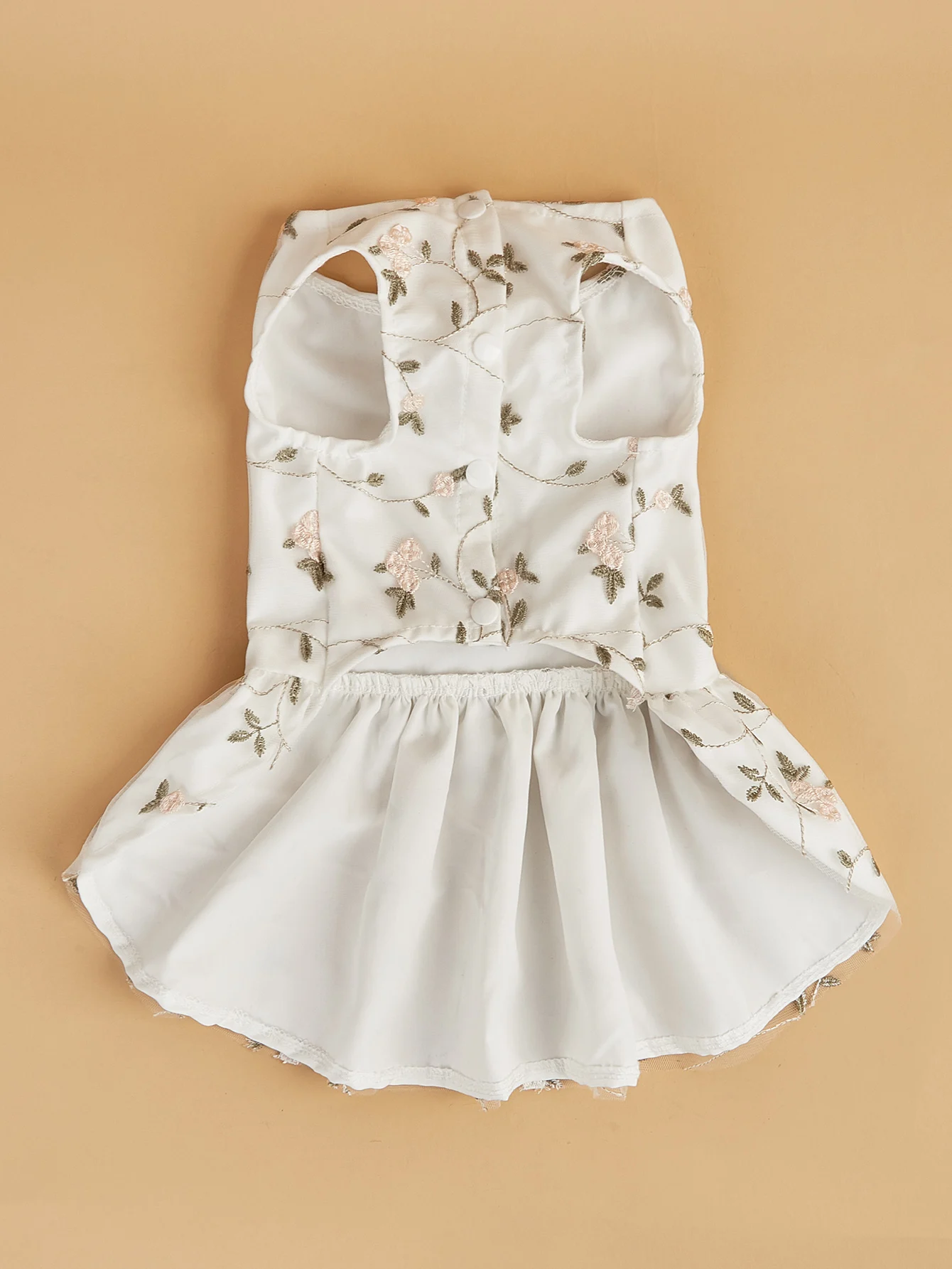 Encantador vestido blanco para perro con lazo blanco y flores bordadas de color rosa claro con tallos y hojas verdes. ¡Mi perrita creció demasiado para la talla pequeña, así que AMO este vestido en ella y acabo de pedir la talla más grande! ¡Altamente recomendado! *****