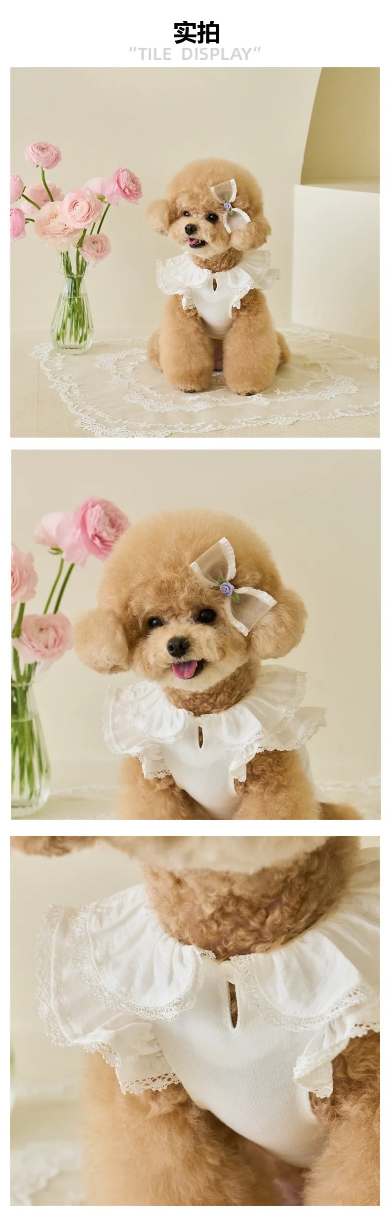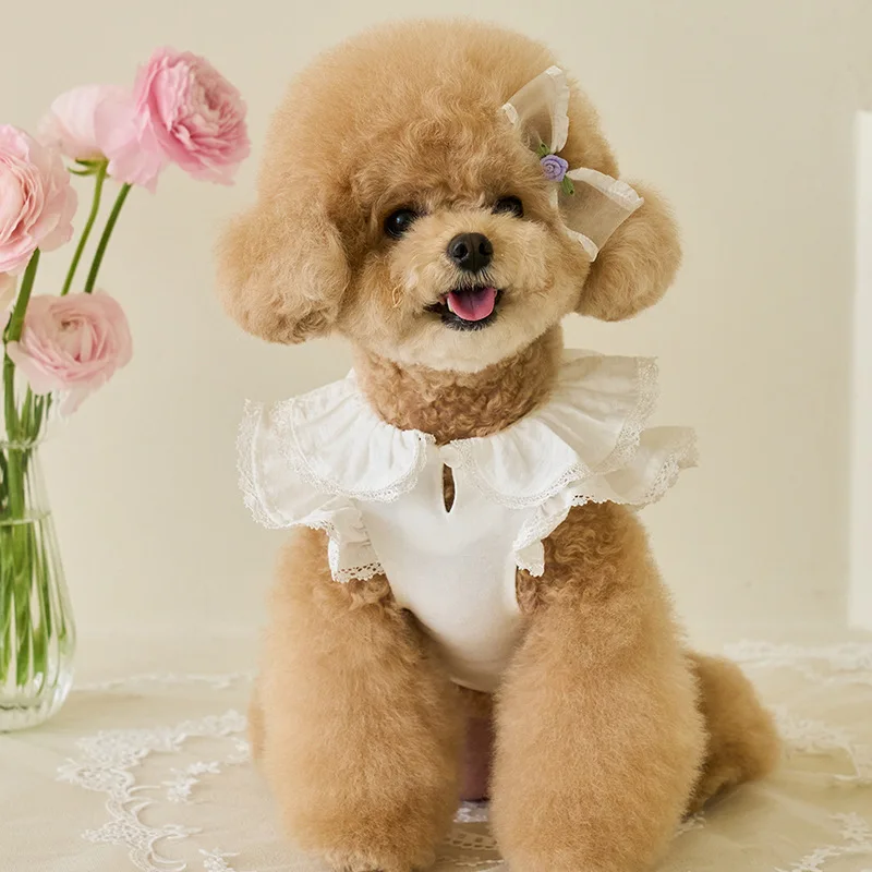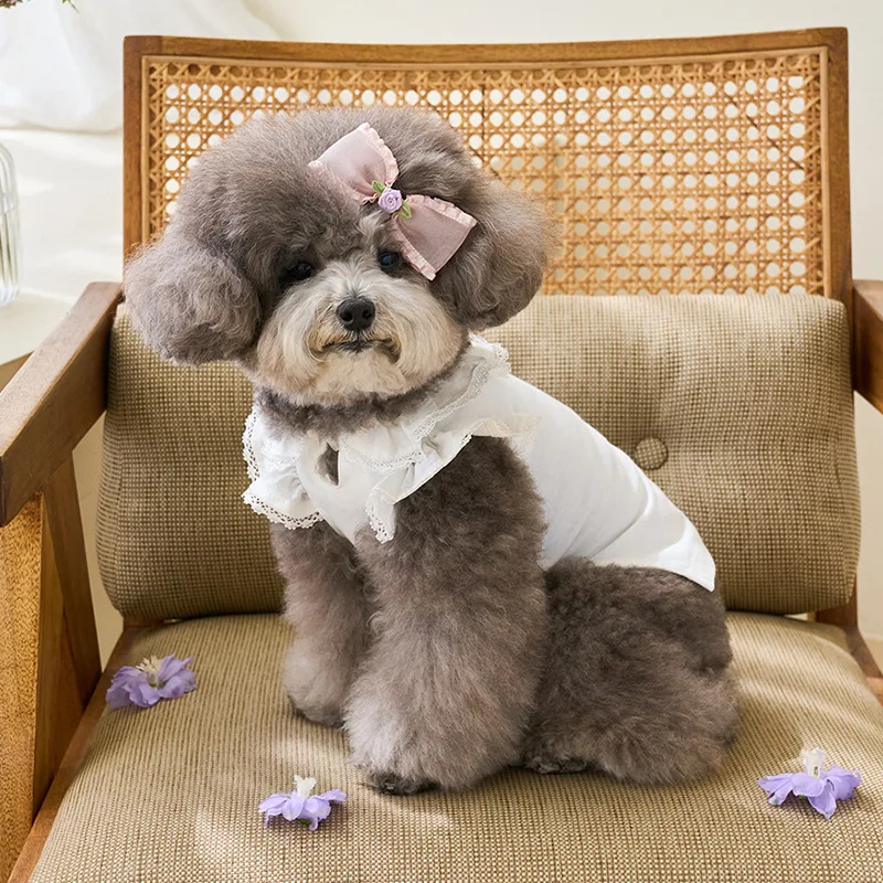 Vestido de primavera para mascotas, camisa con parte inferior de peluche de manga voladora de encaje, camiseta para gatos, ropa para cachorros, ropa para perros pequeños