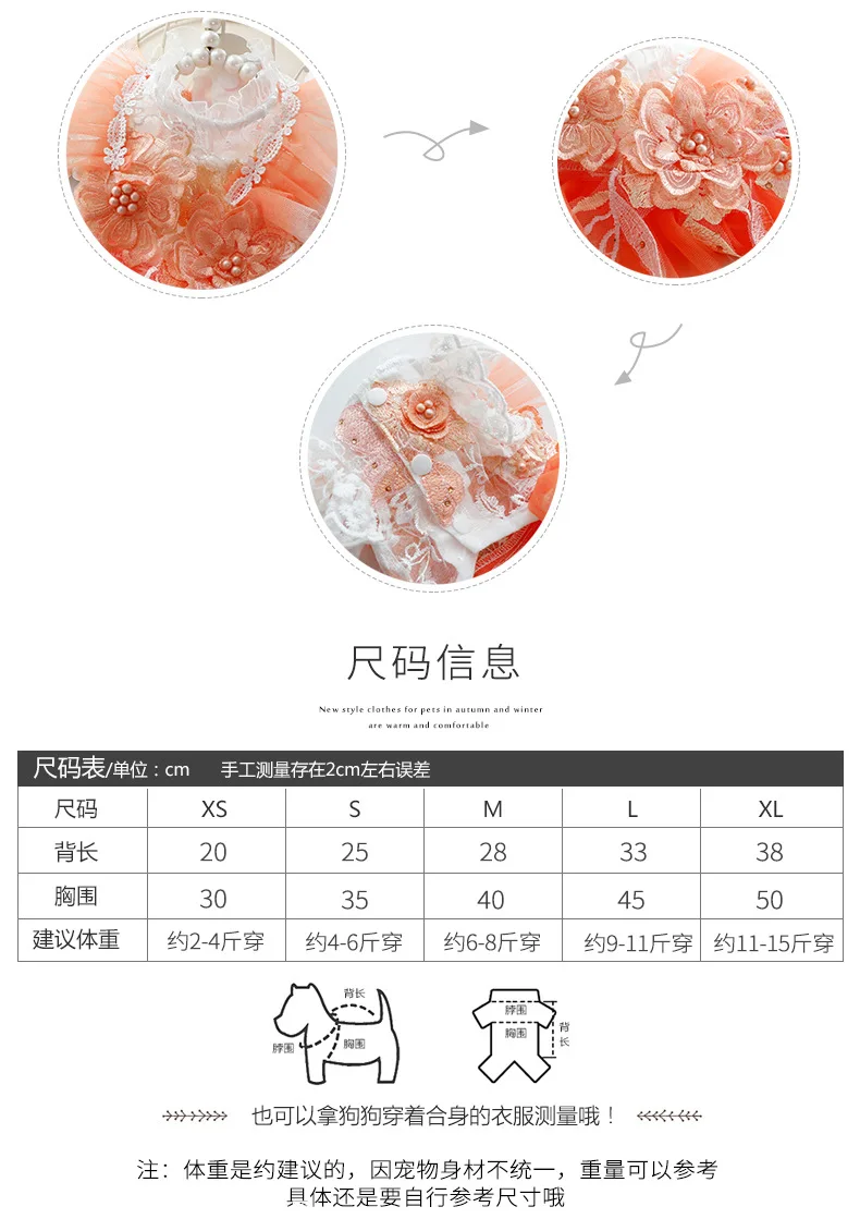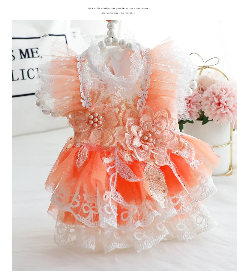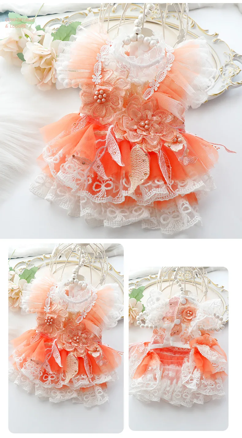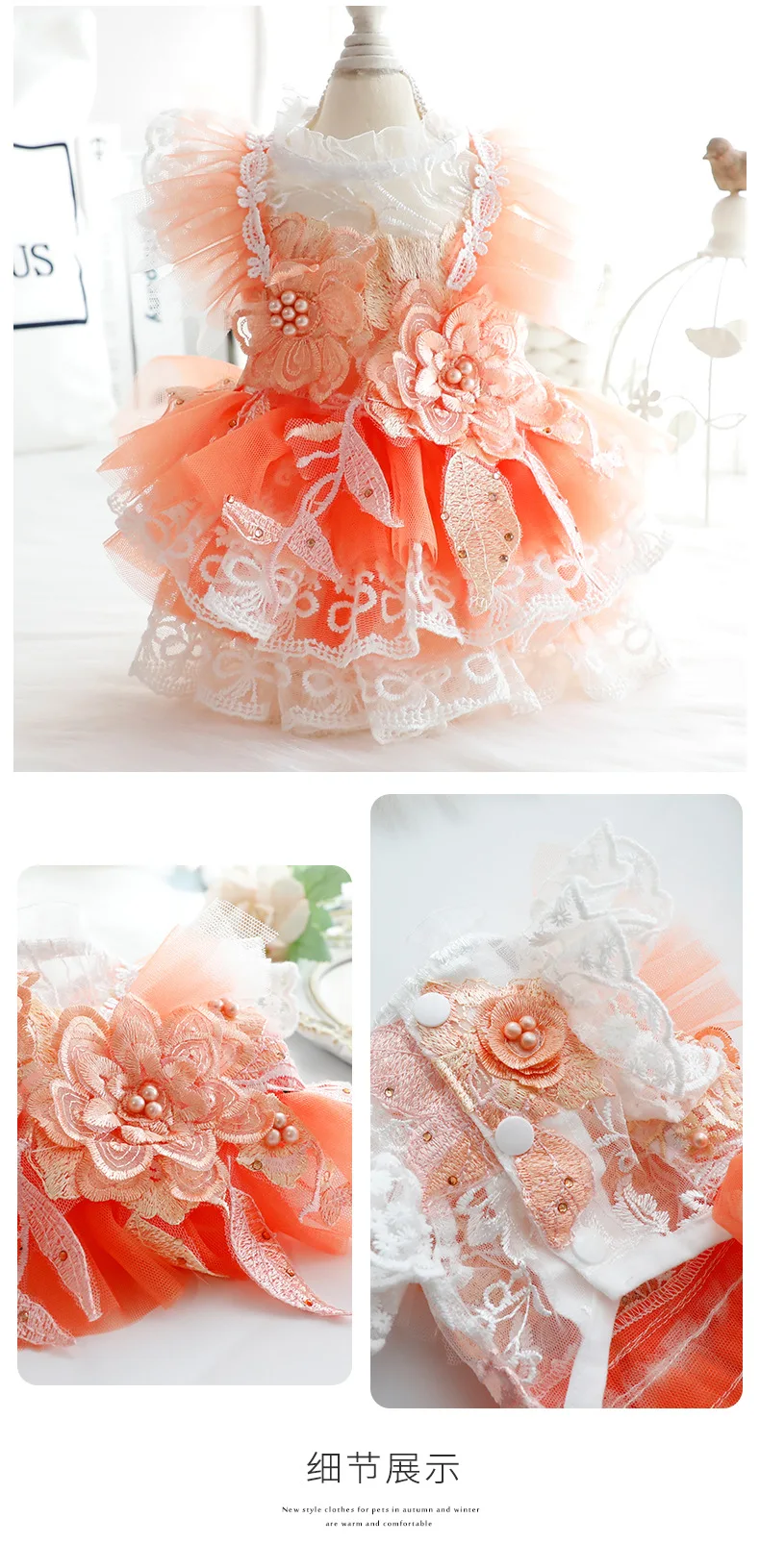 Vestido de princesa calado naranja fino de primavera de verano para perros gatos, ropa para mascotas estilo vestido de novia para perros pequeños