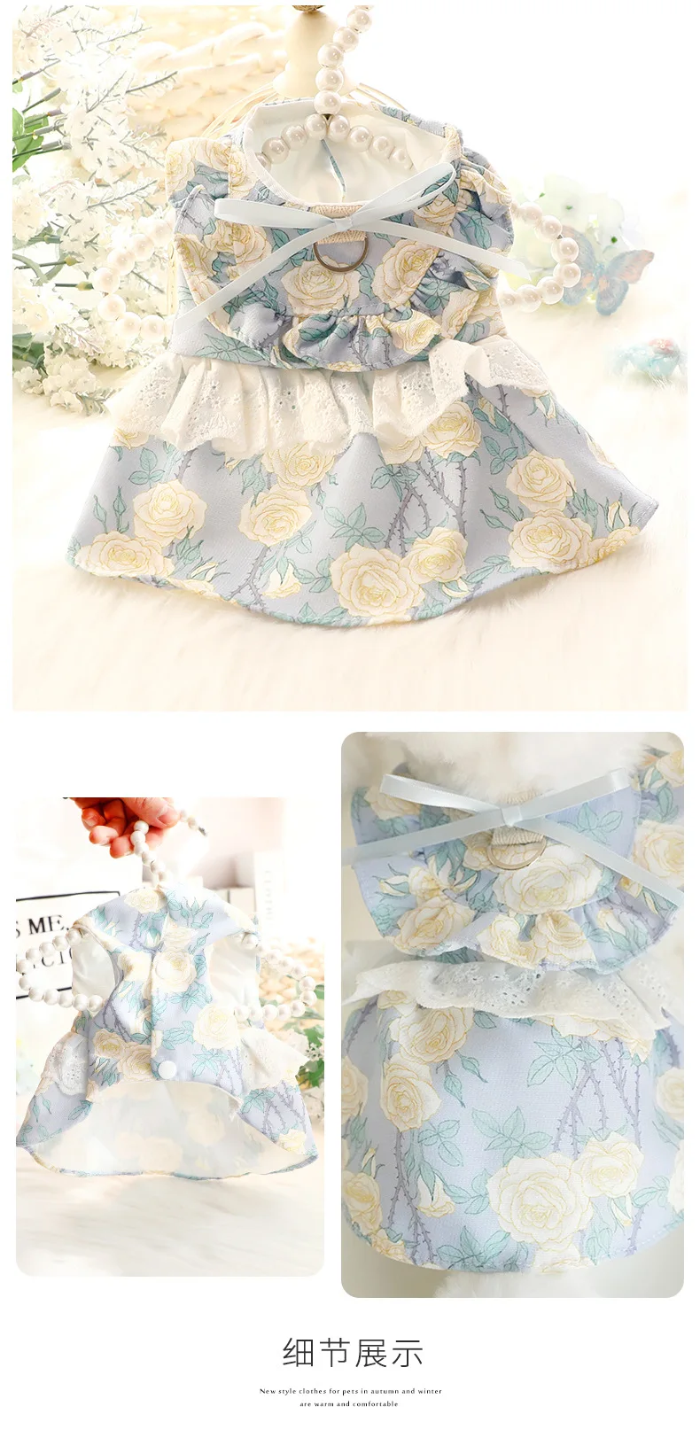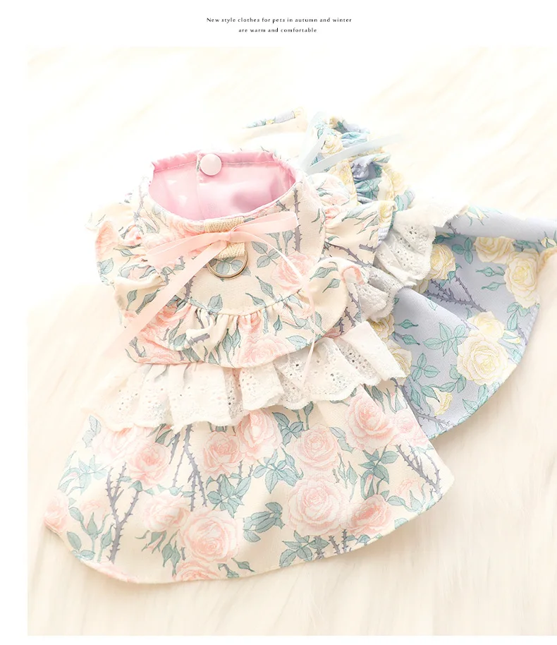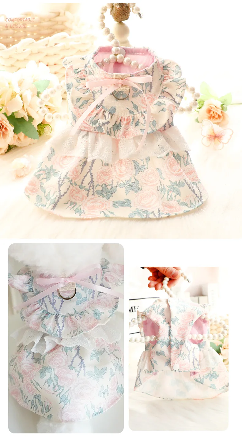 Vestido de princesa fino de primavera y verano, ropa con estampado Floral, falda con volantes y anillo en D para perros pequeños