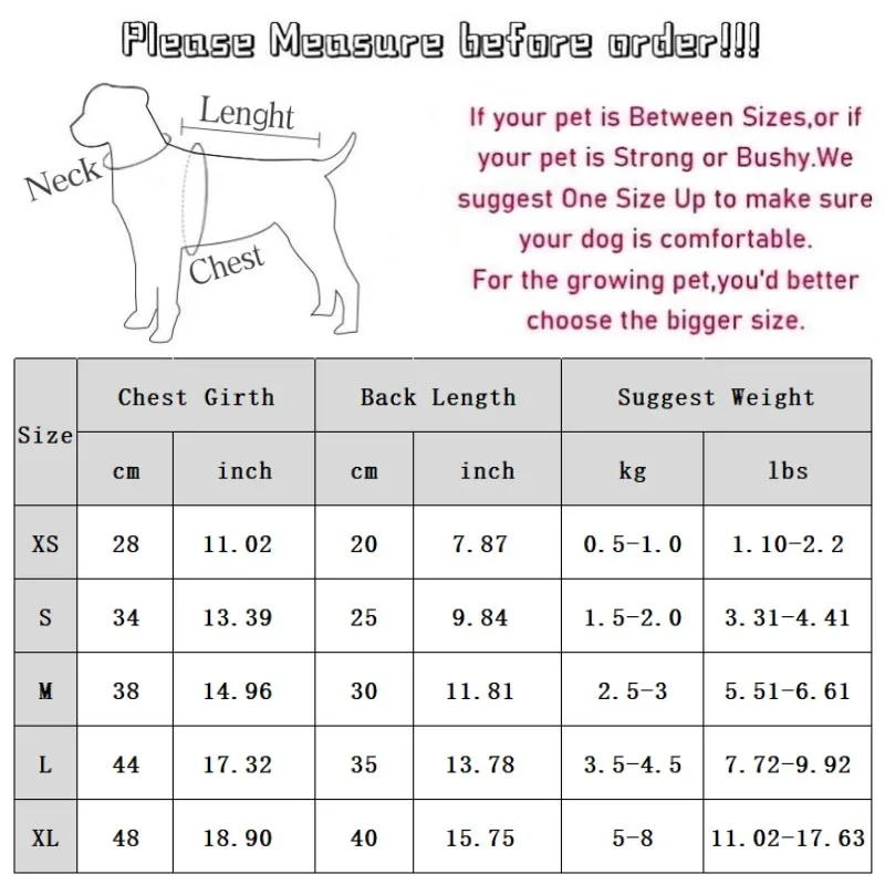 XL: Pecho 48cm/18,90''; Longitud 40cm/15,75''; Peso sugerido 5-8 kg/11,02-17,63 lbs.