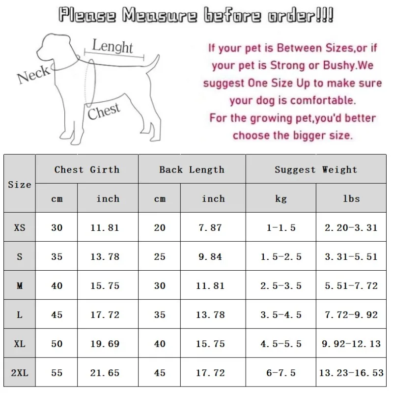 Pecho XXL 55 cm/18,90 '' Longitud 45 cm/17,72 '' Peso sugerido 6,07,5 kg/13,23-16.53 lbs