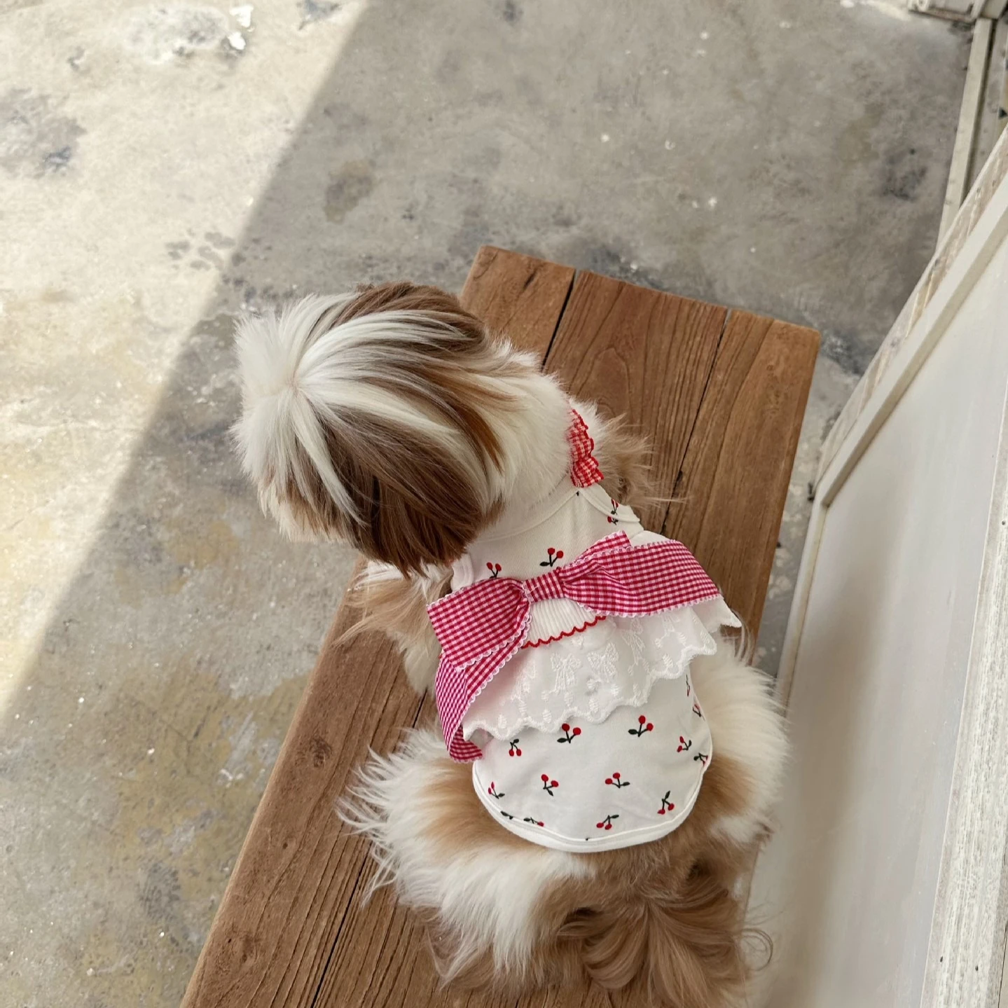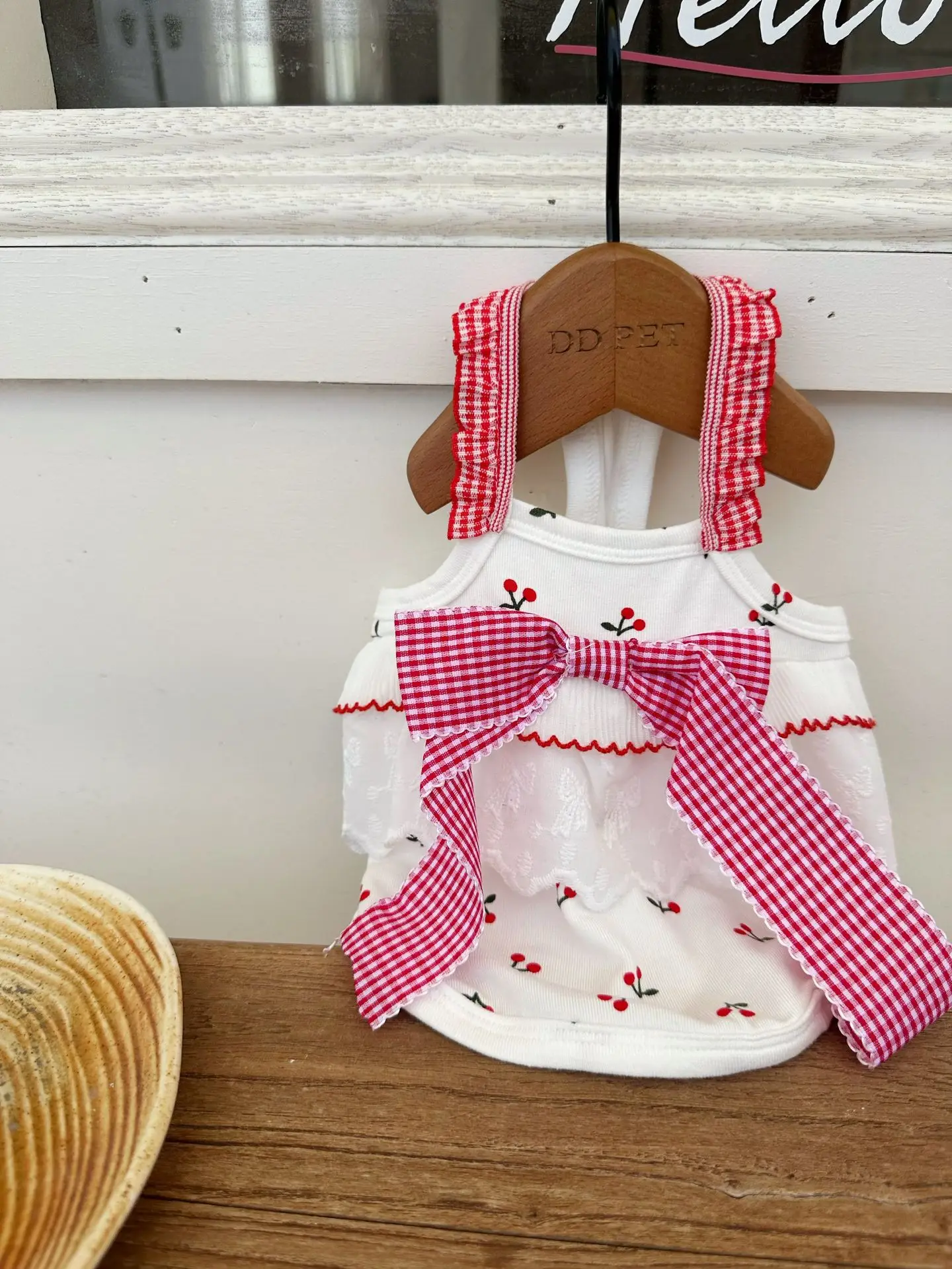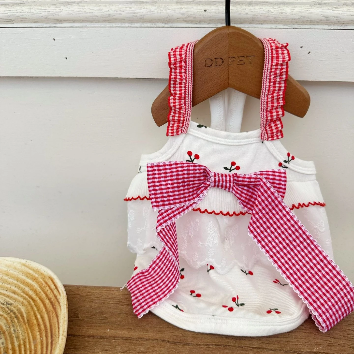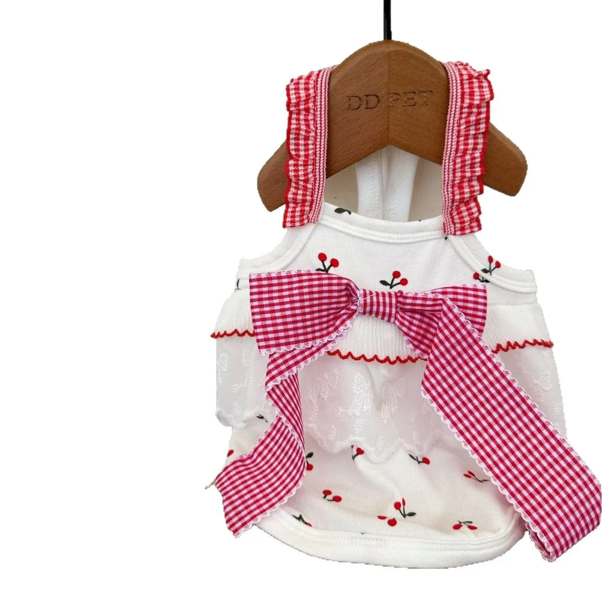 Vestido rojo a cuadros con lazo para mascotas, vestido de tirantes de cereza de peluche Schnauzer, camiseta sin mangas para perros pequeños, ropa para perros pequeños