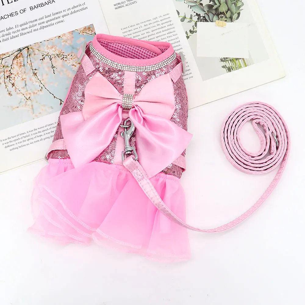 Vestido de gato rosa, vestidos de verano para perros pequeños y gatos con bonito lazo, accesorios de diamantes de imitación ostentosos, chaleco de nailon para mascotas, arnés y correa