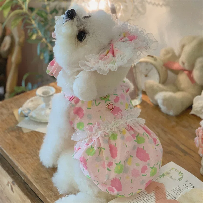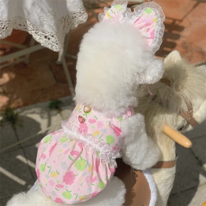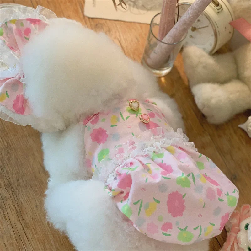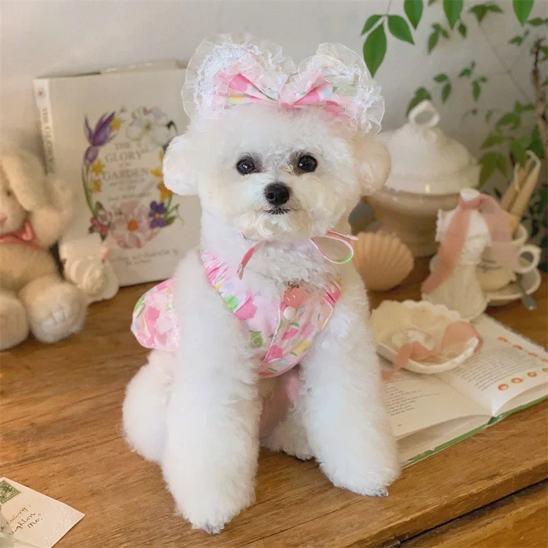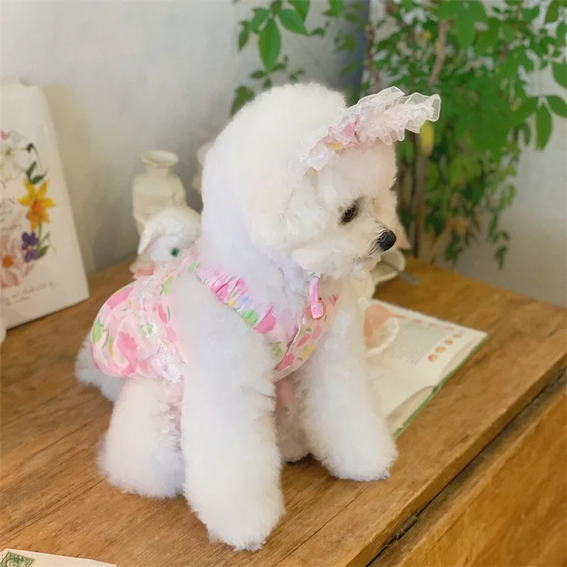 Vestido rosa para perro, vestido rosa con estampado Floral de encaje con volantes y tirantes para perro pequeño, vestido de fiesta de verano para niña, ropa para cachorro y gato XS-XL + sombrero