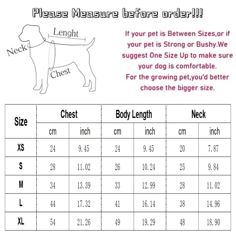 Pecho XL 54 cm/21,26''; Longitud del cuerpo 49 cm/19,29 ''; Cuello 48 cm/18,90''