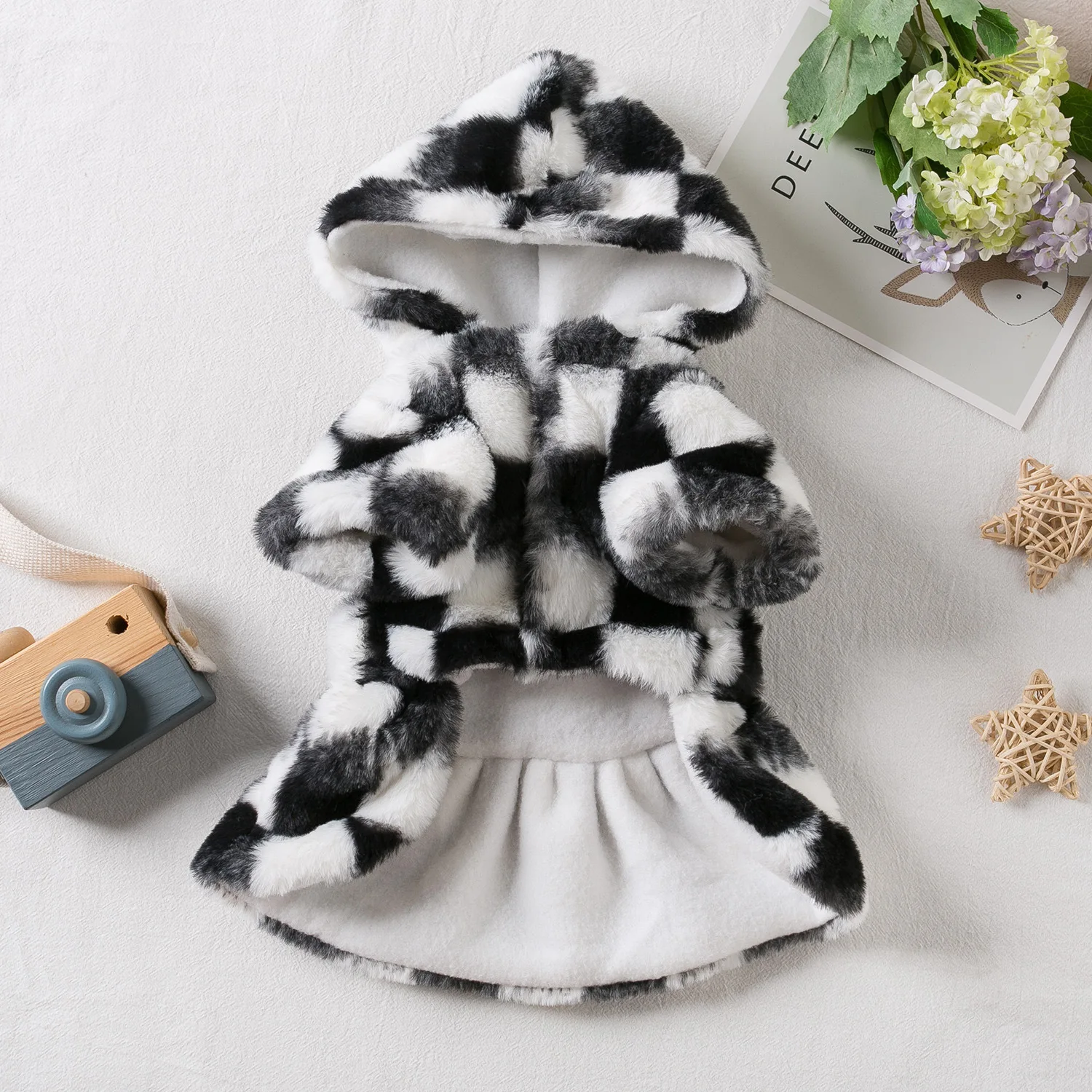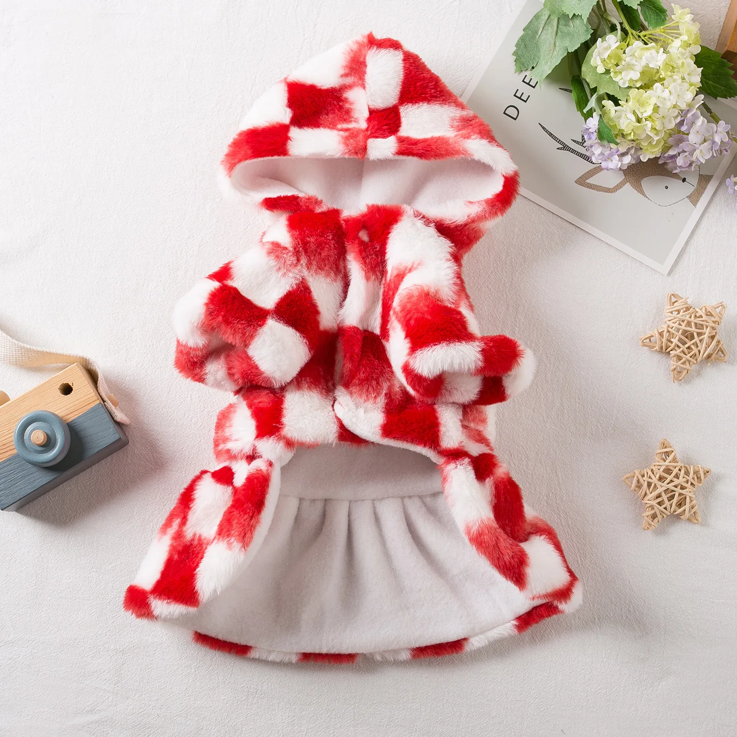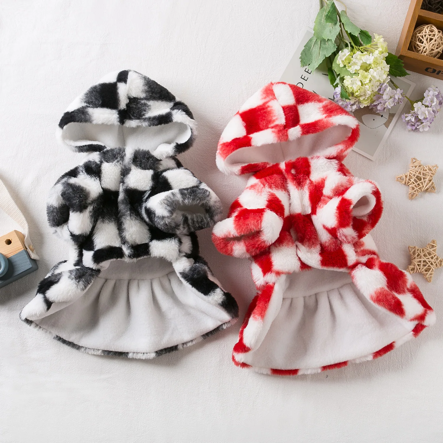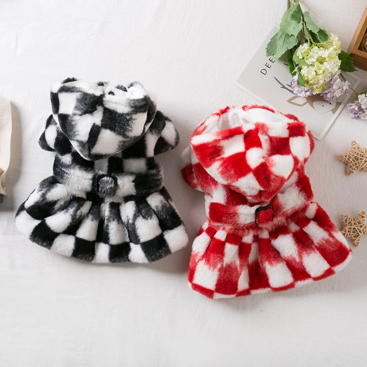 Vestido de tablero de ajedrez de piel con capucha para mascotas, ropa cálida y de felpa para perros y gatos, vestido peludo y bonito para perros pequeños, otoño e invierno