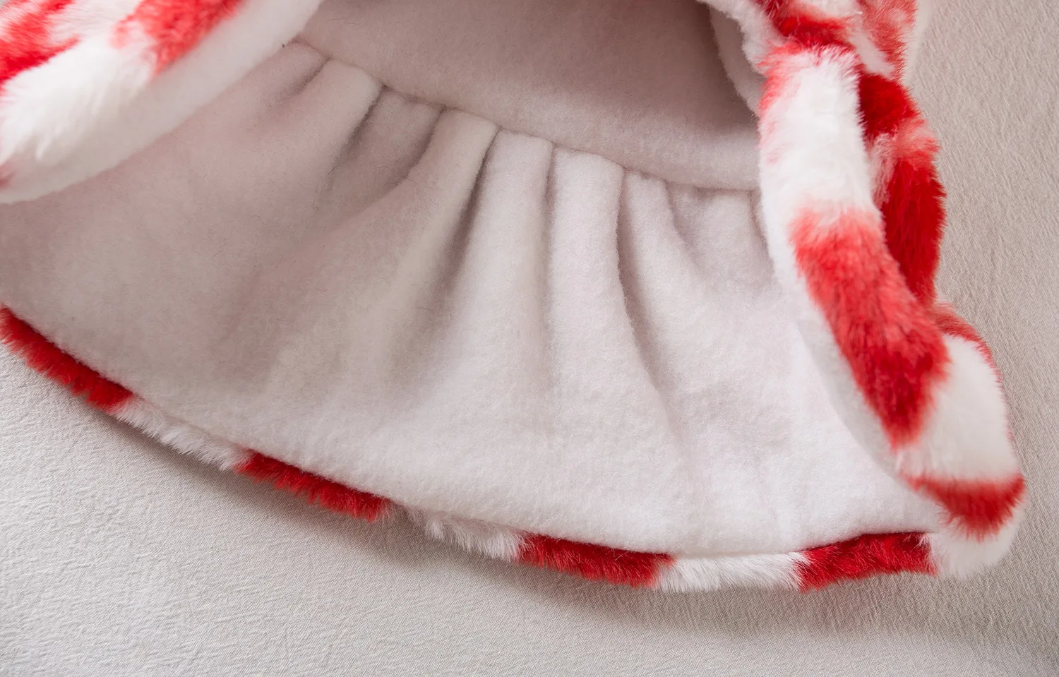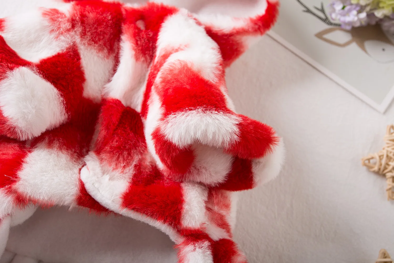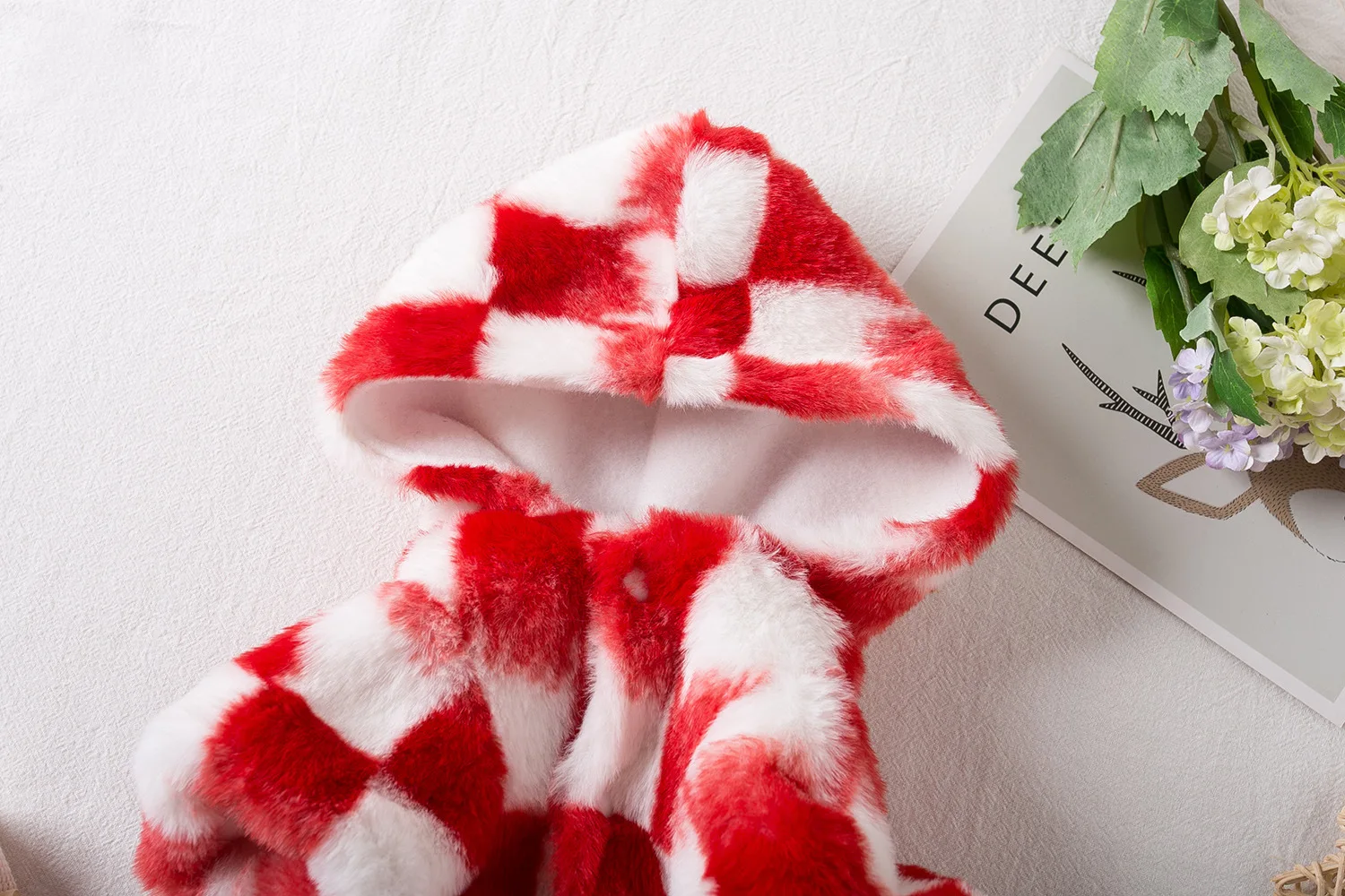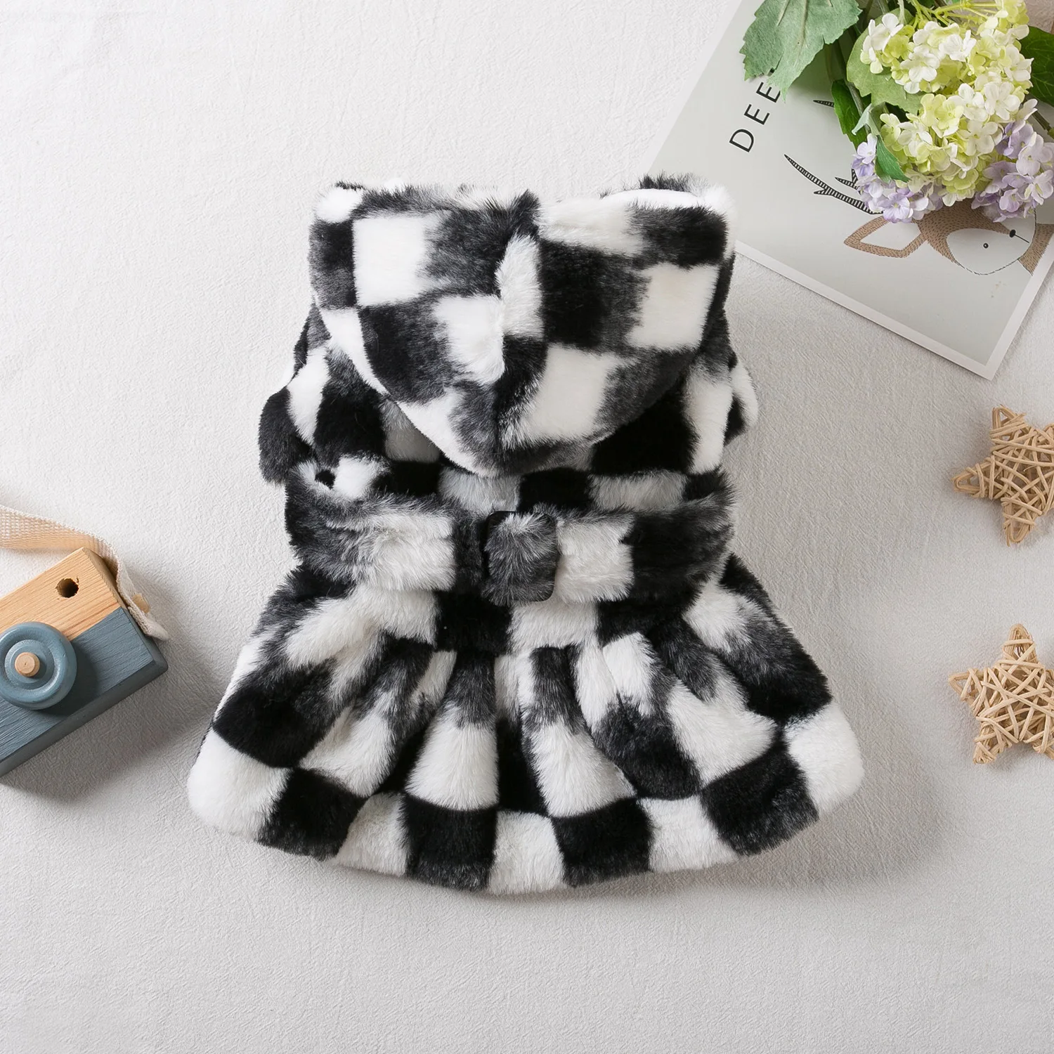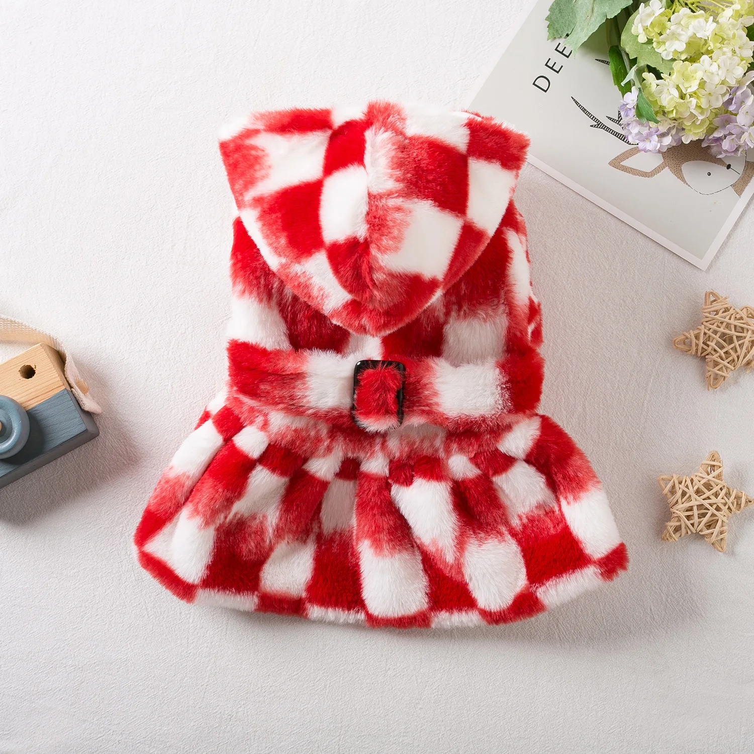 Vestido de tablero de ajedrez de piel con capucha para mascotas, ropa cálida y de felpa para perros y gatos, vestido peludo y bonito para perros pequeños, otoño e invierno
