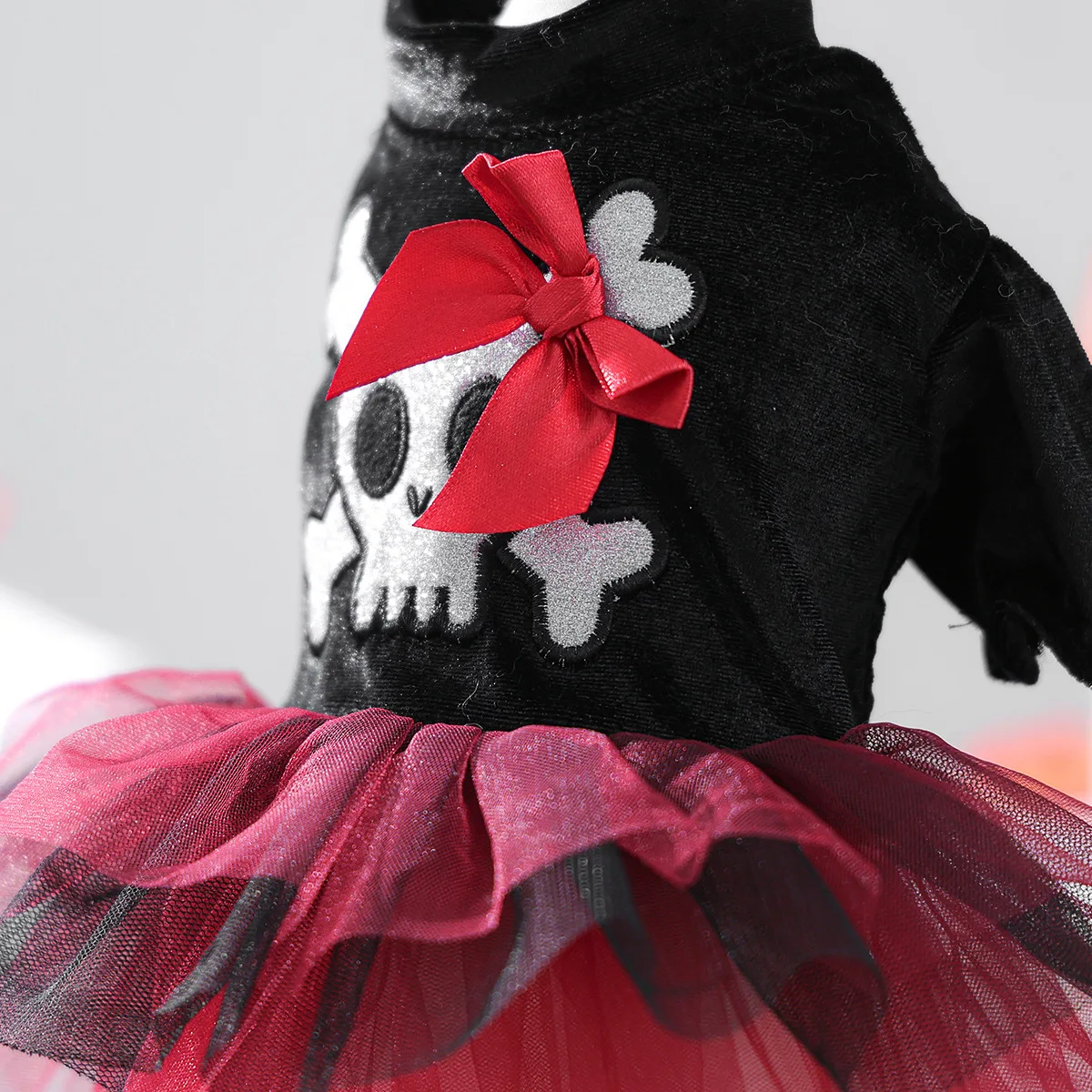 Vestido de terciopelo negro de Halloween para perros, vestido de calavera de piratas negros para mascotas, falda de tul roja para perros, falda tutú para mascotas, ropa para mascotas, ropa de fiesta