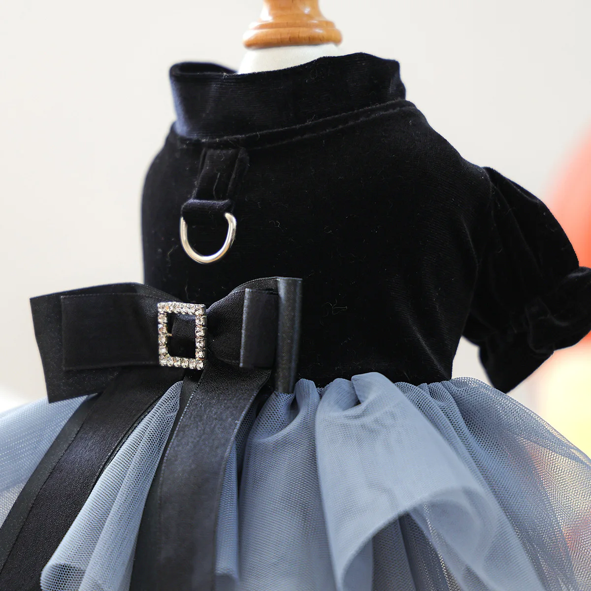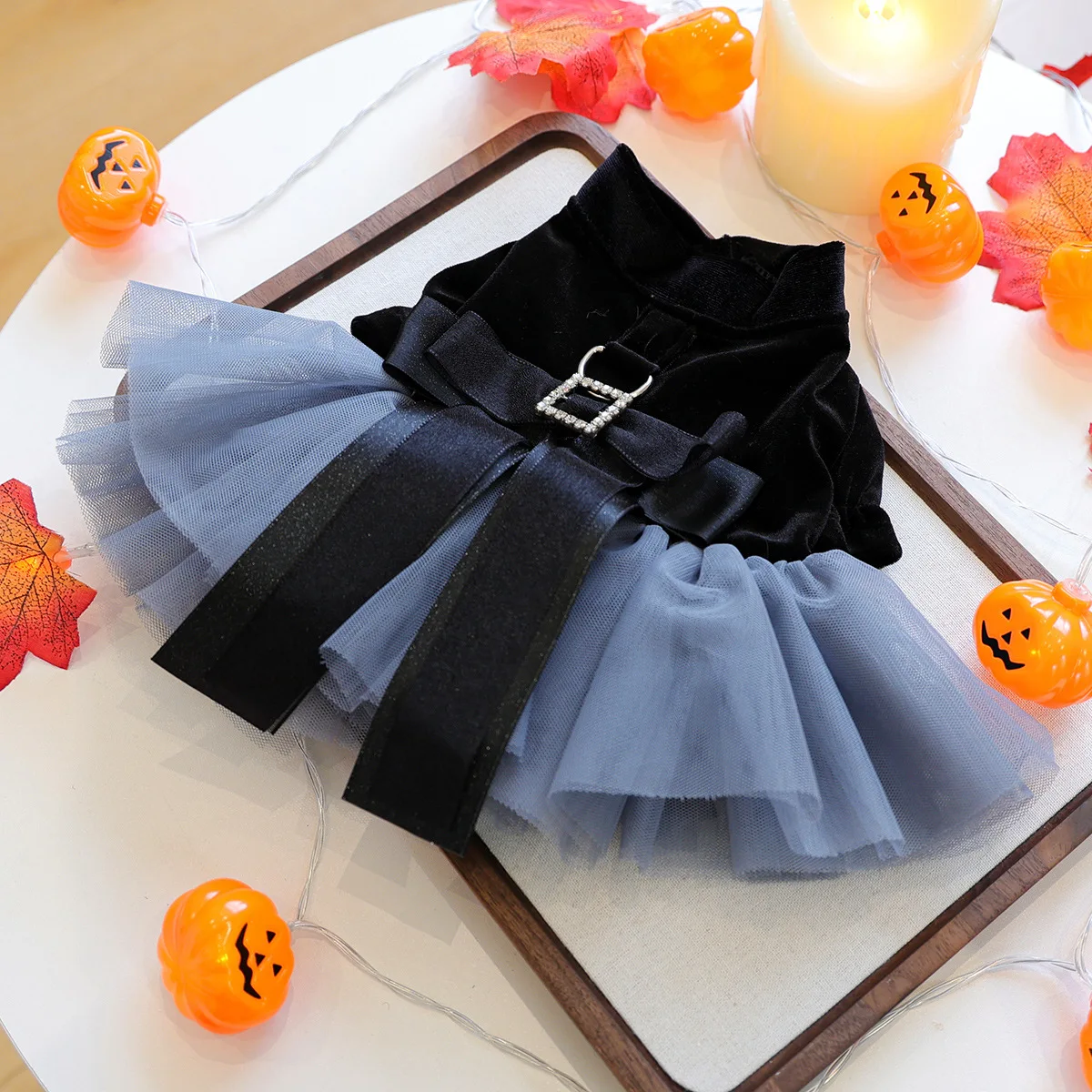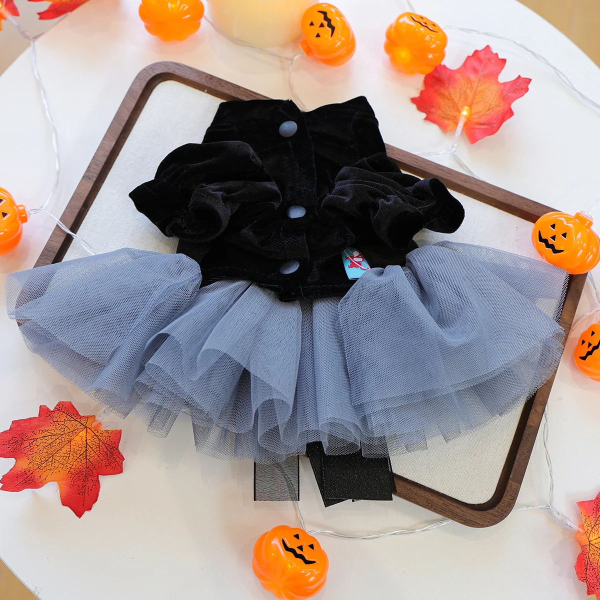 Vestido de terciopelo negro de Halloween para perros, vestido negro para mascotas con lazo, falda de tul para perros, falda tutú para mascotas, ropa de cosplay para mascotas, ropa de fiesta para mascotas