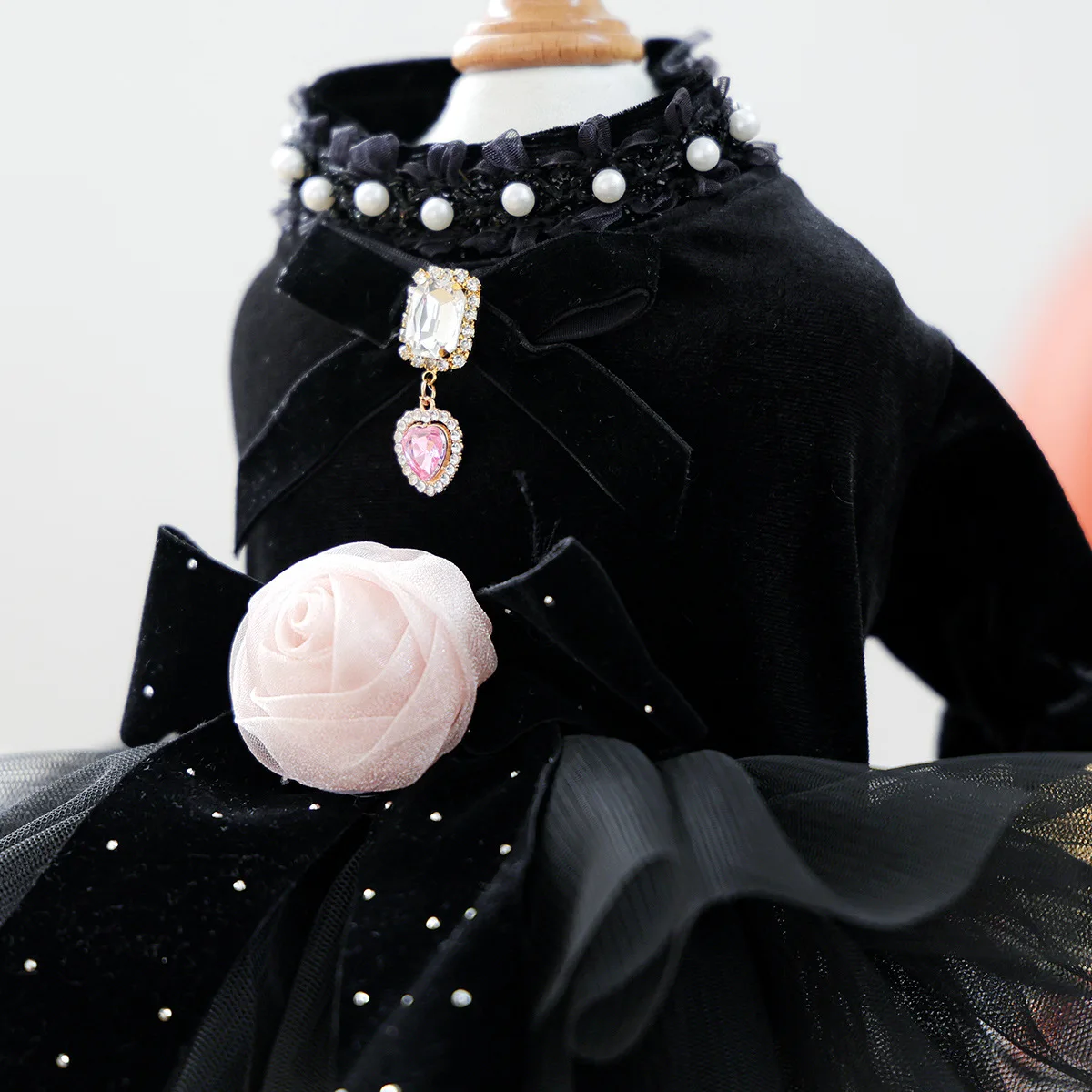 Vestido de terciopelo negro de Halloween para perros, vestido negro para mascotas con lazo y rosa, falda de tul para perros, falda tutú para mascotas, ropa para perros, ropa de fiesta para mascotas