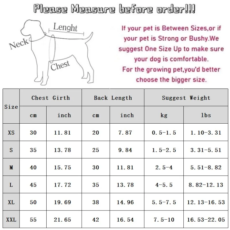 XXL: Pecho 55 cm/21,65''; Longitud 42 cm/16,54''; Peso sugerido 7,5-10 kg/16,5-22,05 libras.