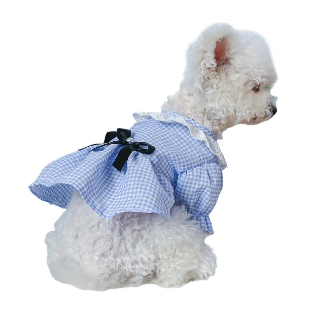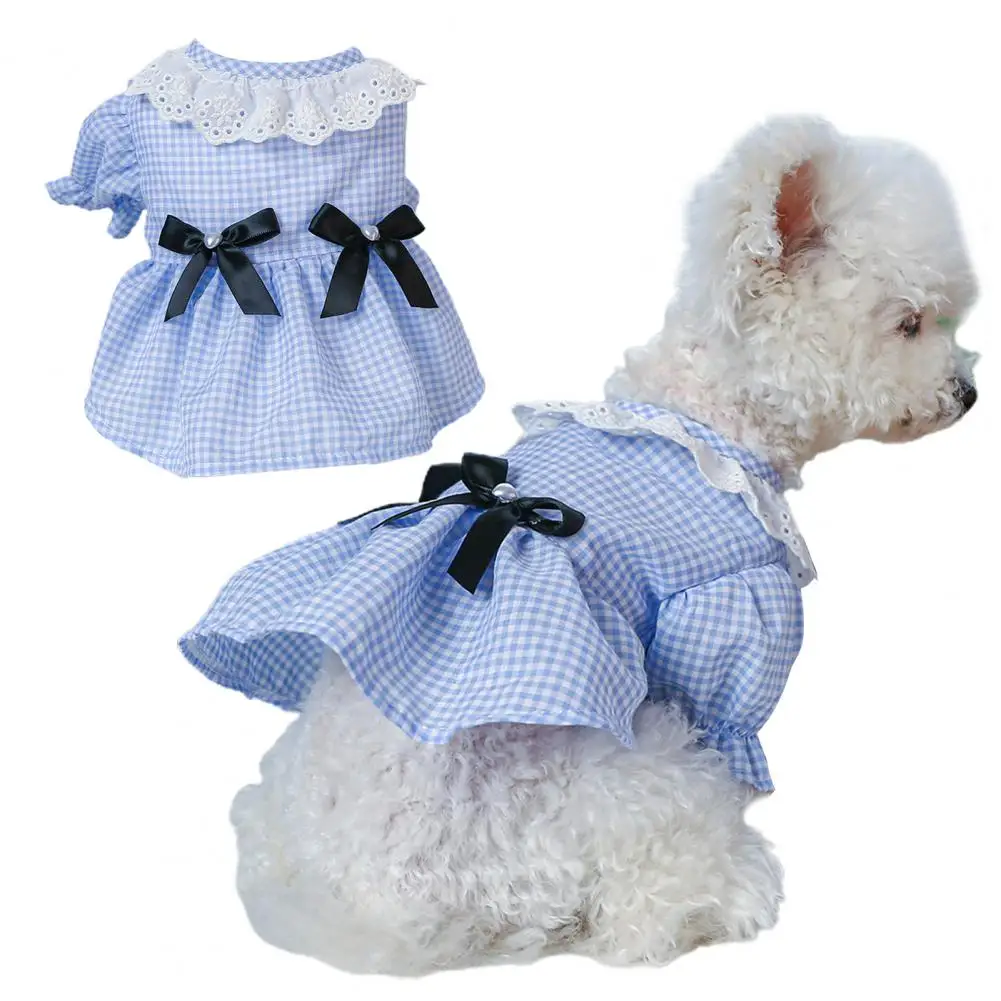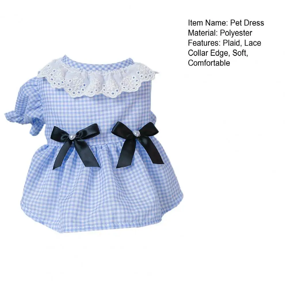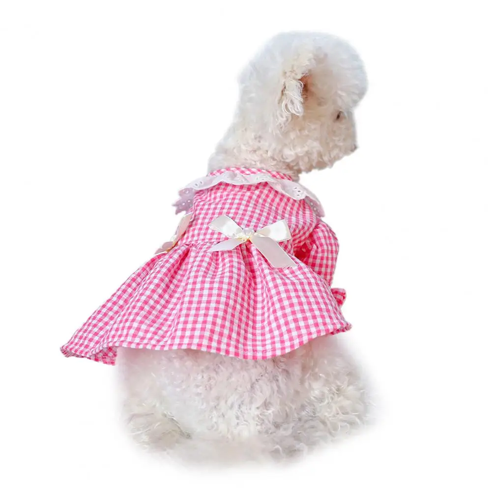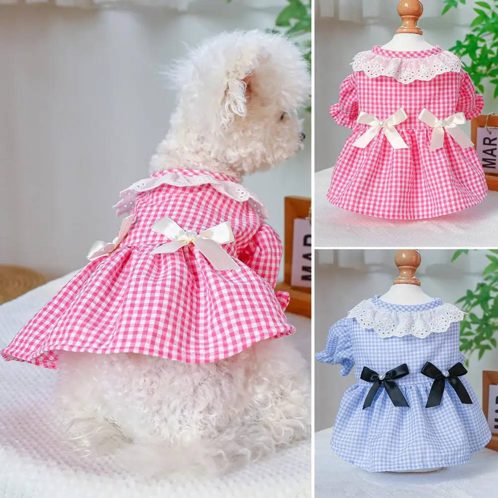 El vestido para mascotas tiene estampado a cuadros, cuello de encaje, decoración de lazo, mano de obra exquisita y colores brillantes. Se cierra con botones y es fácil de poner y quitar.