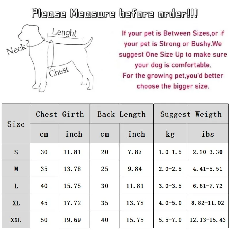 XXL Longitud de la espalda 40 cm/15,75 pulgadas Circunferencia del pecho 50 cm/19,69 pulgadas Peso sugerido 5,5-7,0 kg/12,13-15,43 lbs