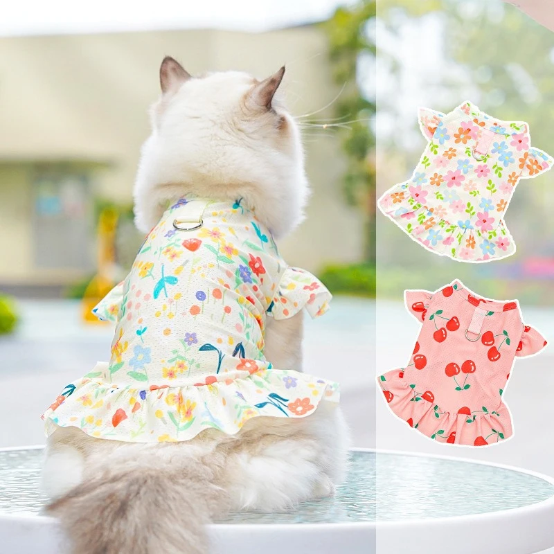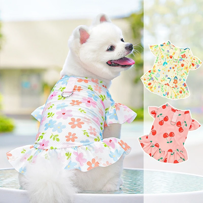 Vestidos florales de verano con mangas aleteadas para cachorros, ropa fresca de seda helada para perros pequeños y medianos, protección UV, monos de ocio para gatos y mascotas