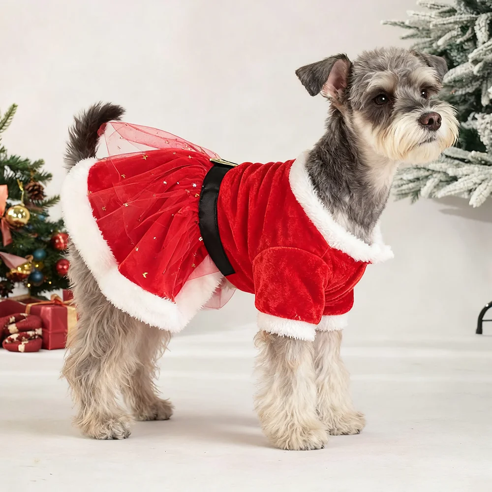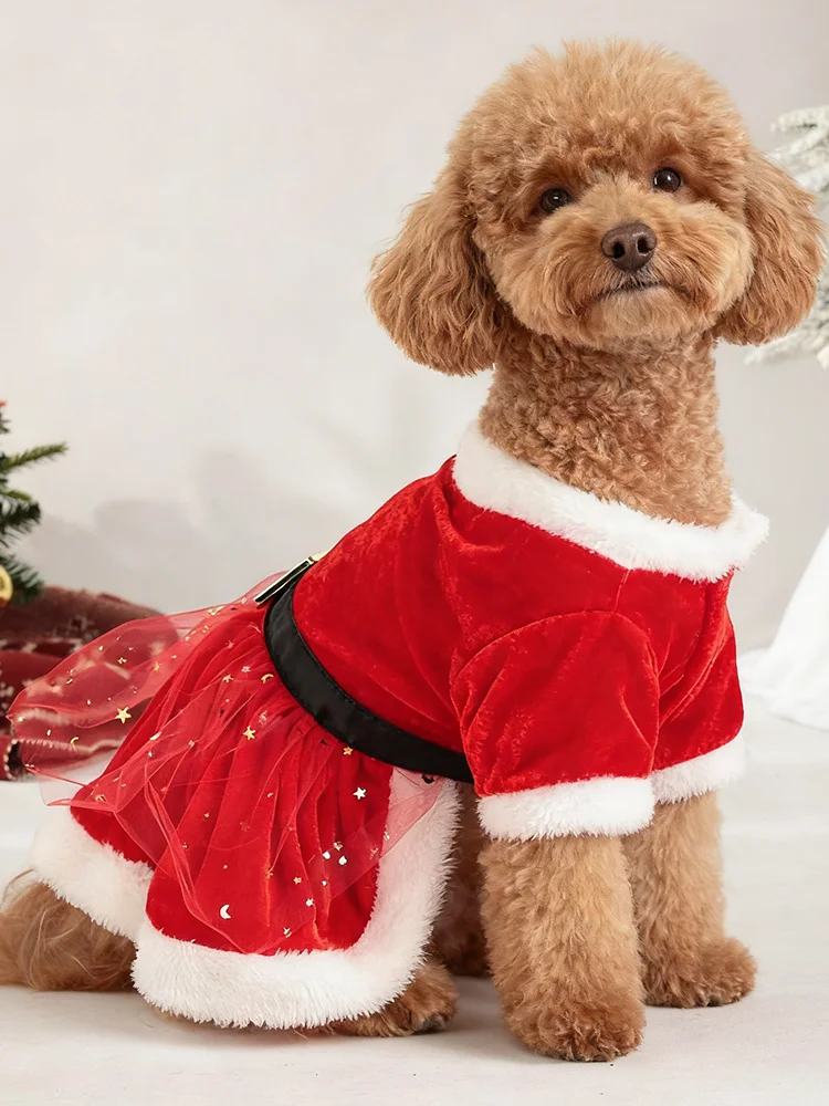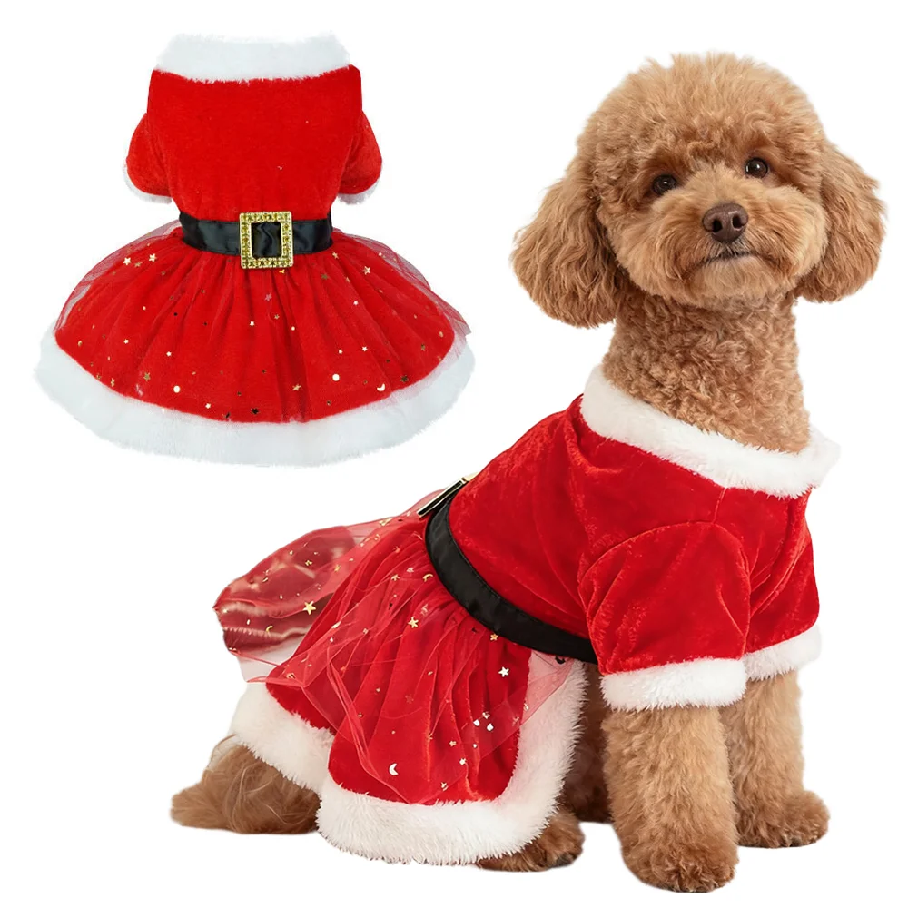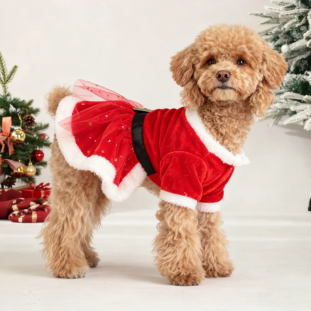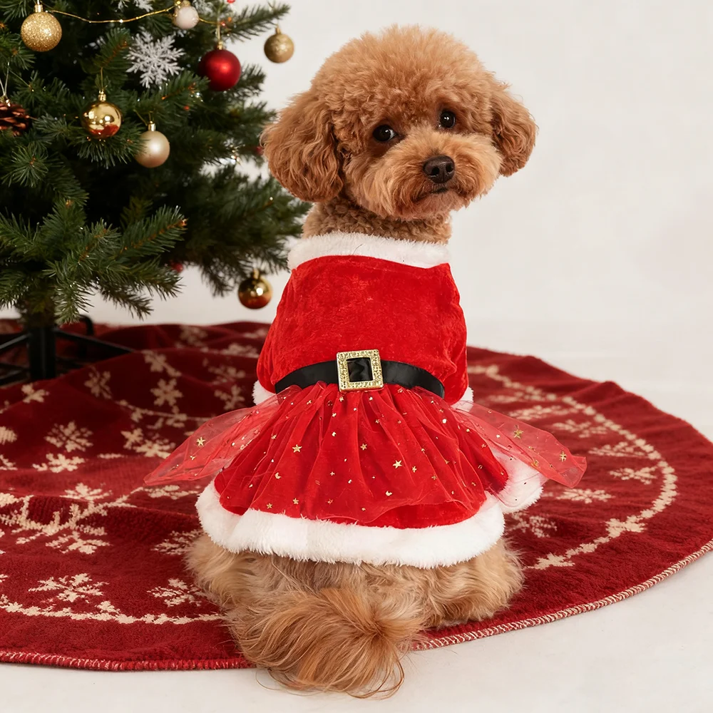 Vestidos navideños para perros pequeños, vestido de princesa para cachorros de Navidad de invierno con cinturón, falda de encaje polar para mascotas, disfraces de Papá Noel