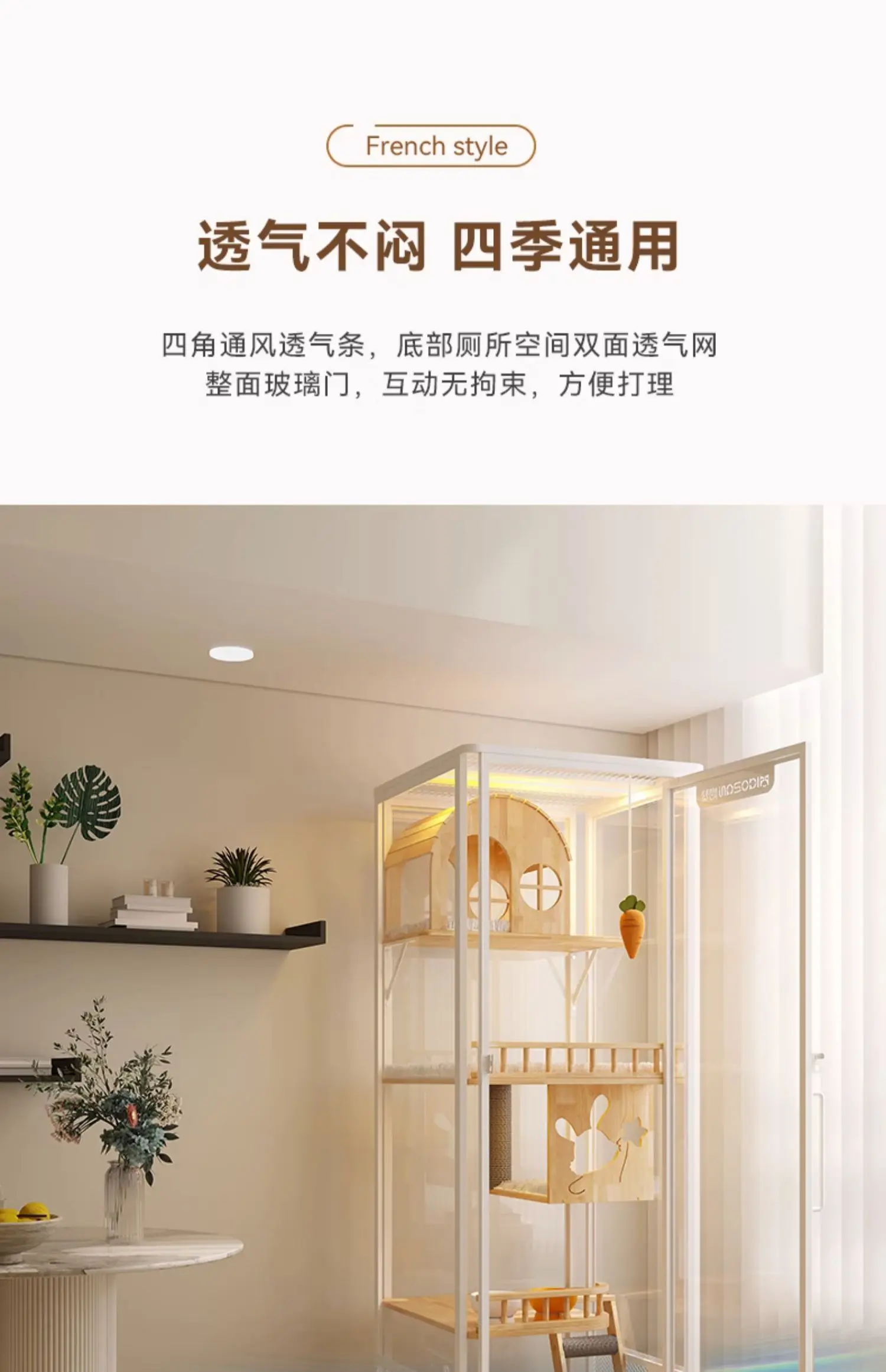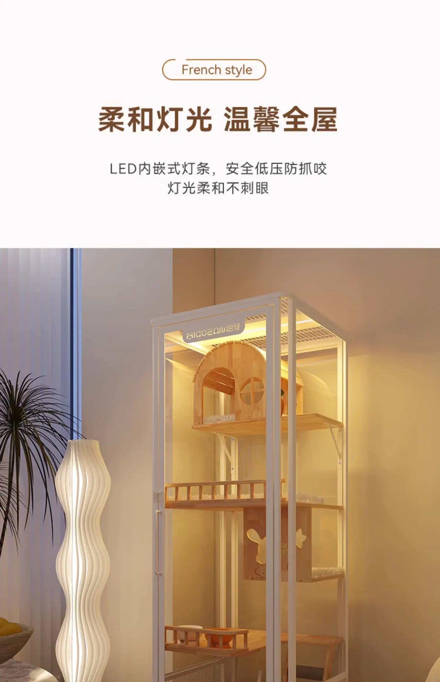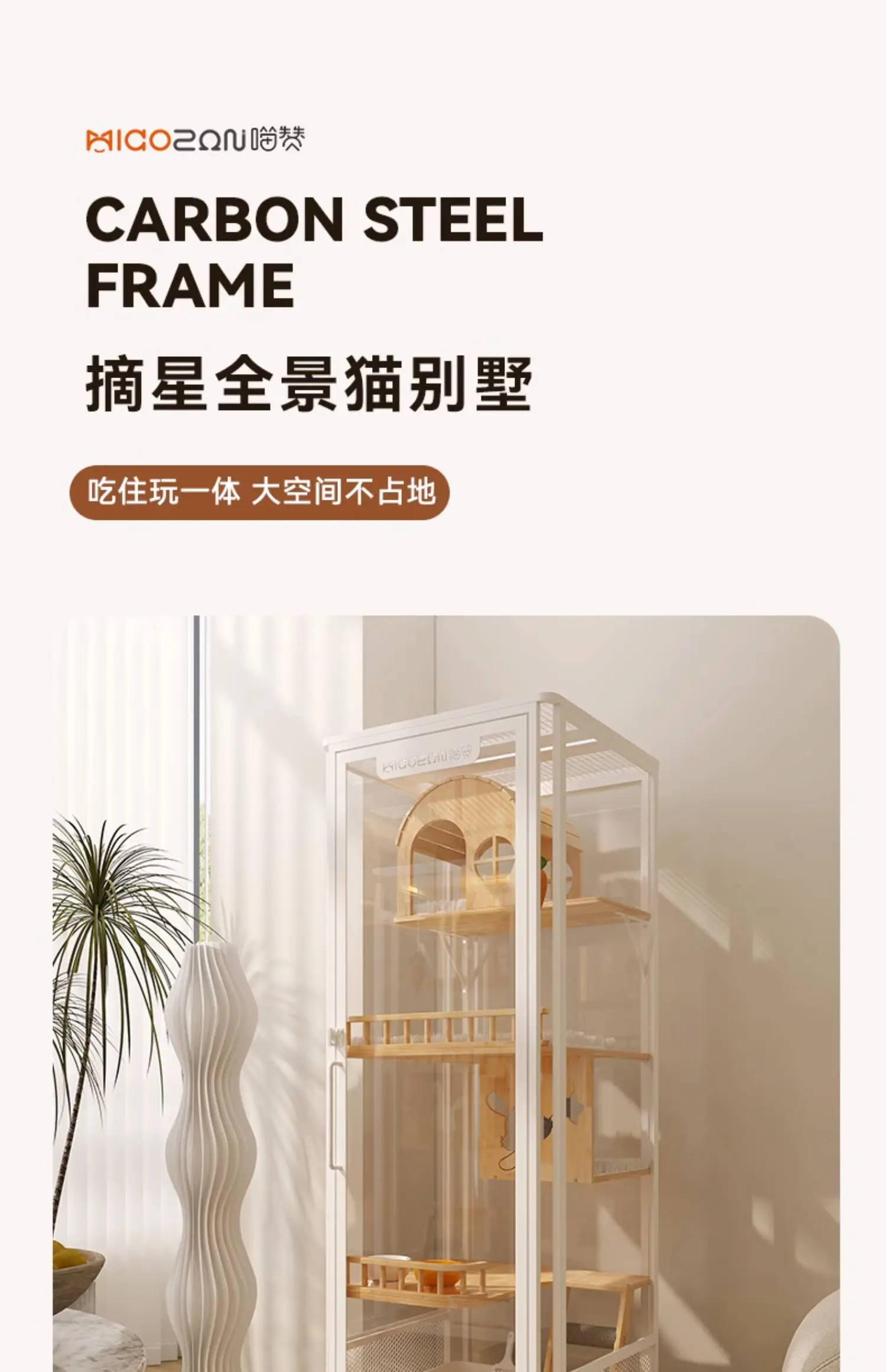 La villa para gatos presenta un gran diseño de vidrio panorámico, que brinda a su amigo felino una vista clara de su entorno y un amplio espacio para jugar y descansar.
