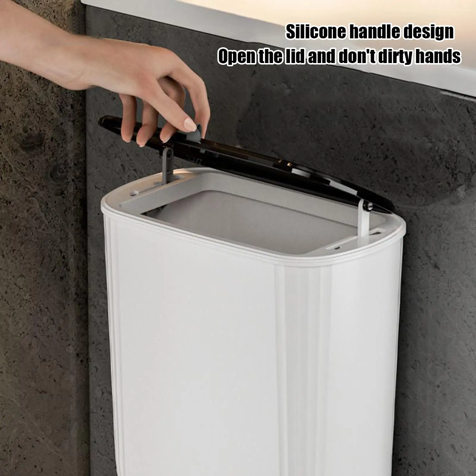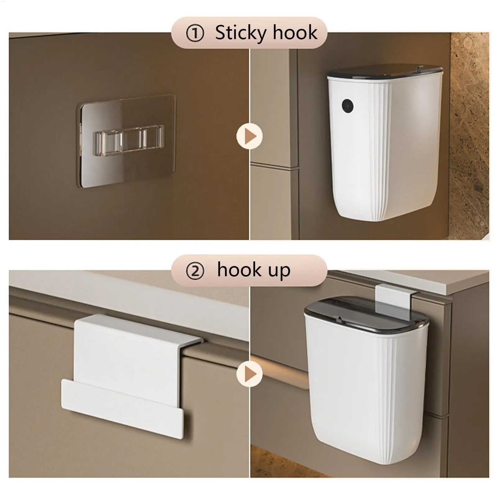 2.No-Drill Installation: The wall mounted trash can bathroom includes a practical cabinet door hook design, enabling easy attachment to cabinet doors or drawers, providing versatile placement options and ensuring seamless integration into various home environments without occupying valuable floor space