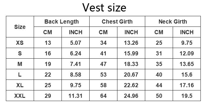 Tamaño del chaleco 3XL: Longitud de espalda 34CM, pecho 70CM, cuello 54CM