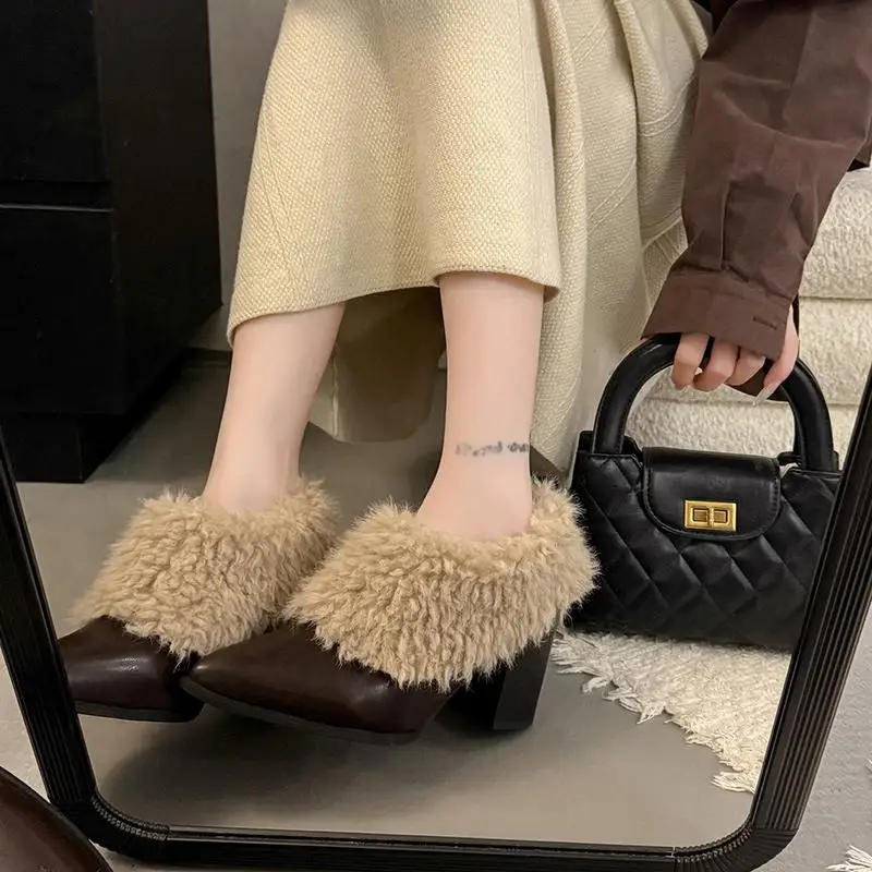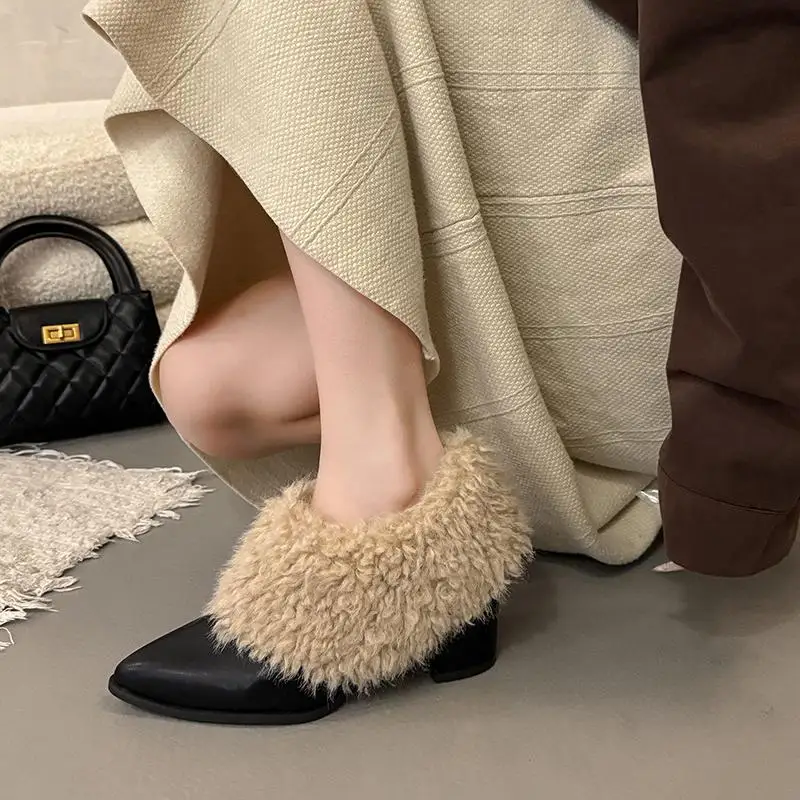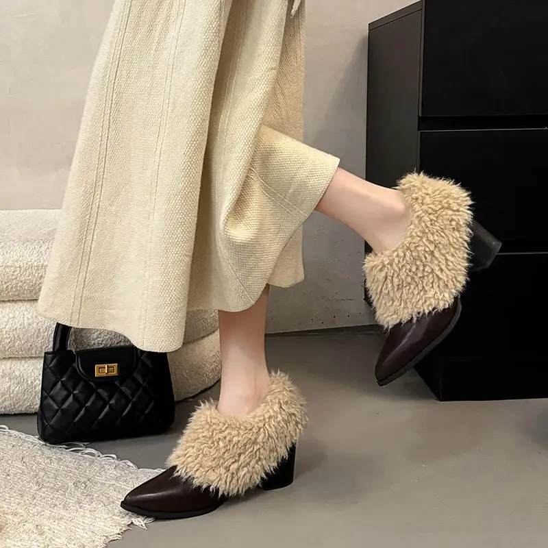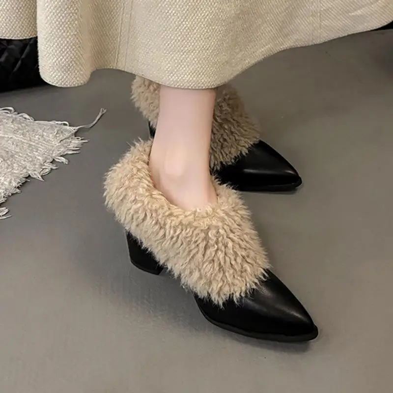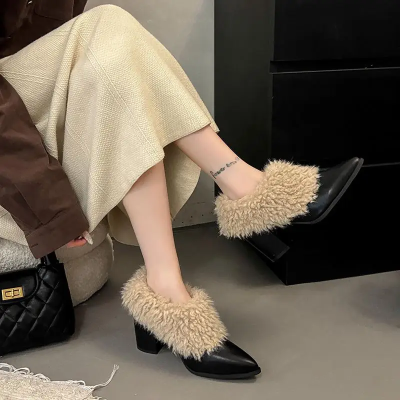 Warm Fluffy Fur Thick High Heel Pumps Women Autumn Sexy Pointed Toe Furry Designer Ankle Boots Woman's Winter Short Boots