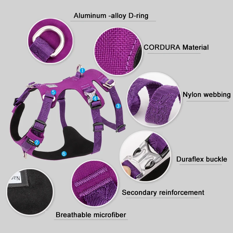 El arnés para mascotas está hecho de correas de hilo de nailon, en comparación con las correas de nailon comunes, es más suave y no abrasivo para la piel del perro, y este material hace que las correas del arnés para mascotas sean más resistentes y duraderas.