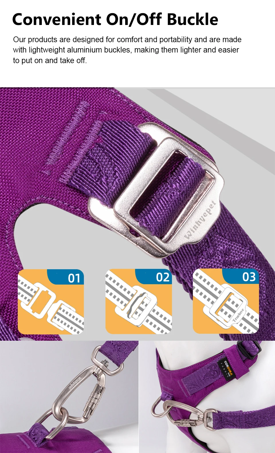 La parte de la hebilla está hecha de material liviano y material de aluminio aeronáutico de alta dureza, peso liviano sin carga para la mascota, liviano y duradero, fácil de poner y quitar.