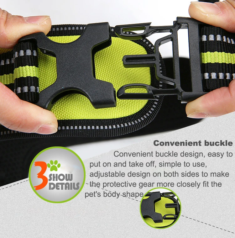 3. Diseño de hebilla conveniente, fácil de poner y quitar, diseño ajustable en ambos lados para que el equipo de protección se ajuste mejor a la forma del cuerpo de la mascota.