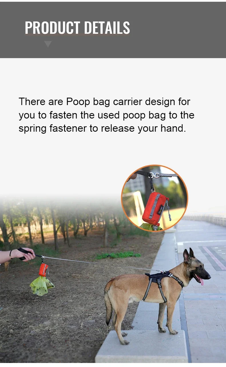4.Puedes colgar la bolsa portátil en el arnés para mascotas, pero también en la correa del perro, compacta y cómoda.