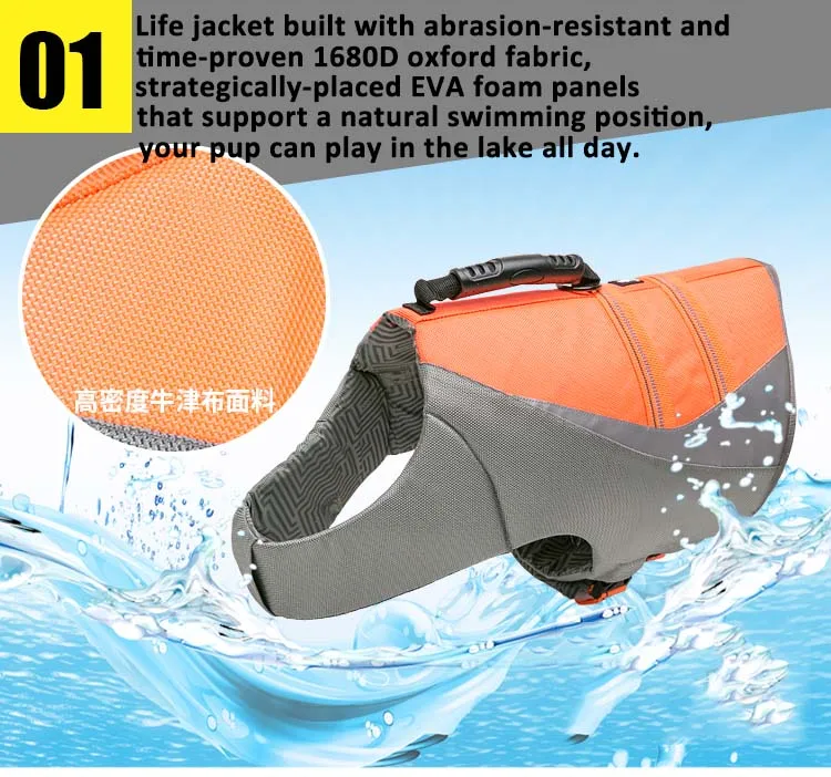 Tela Oxford 168DChaleco salvavidas construido con tejido Oxford 168D resistente a la abrasión y digno del tiempo, paneles EvAfoam estratégicamente ubicados que soportan una posición de natación natural, su cachorro puede jugar en el lago todo el día.