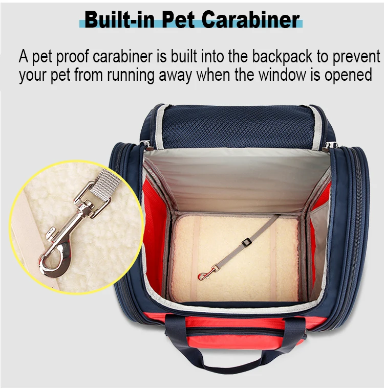 Un mosquetón a prueba de mascotas está integrado en la mochila para evitar que su mascota huya cuando se abre la ventana