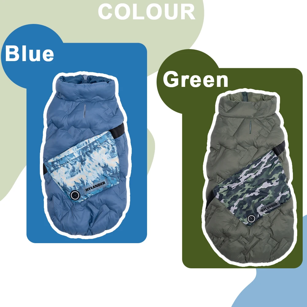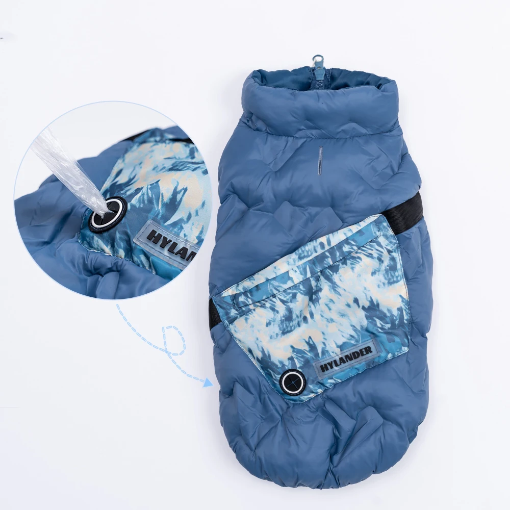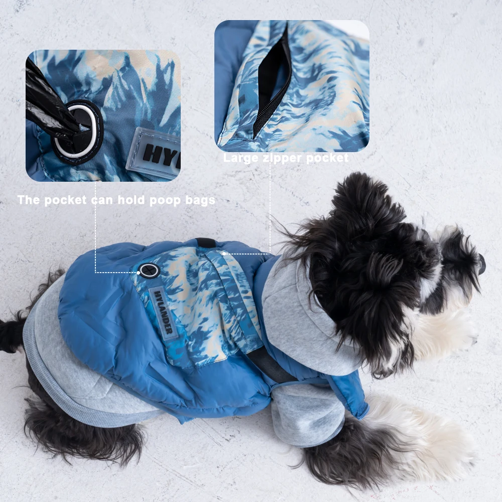 La chaqueta para perros viene con bolsillos para golosinas y bolsas para excrementos.