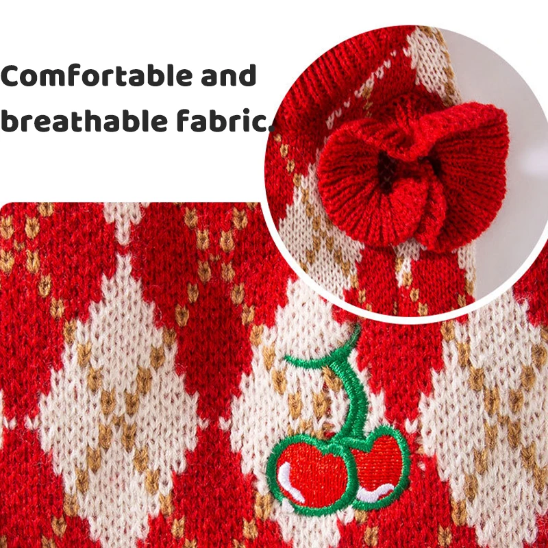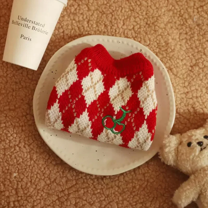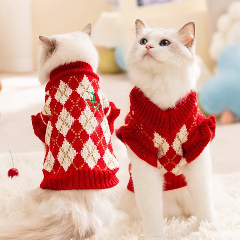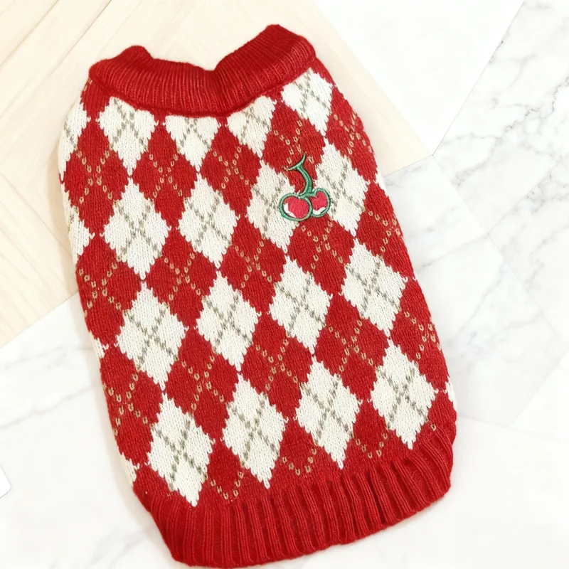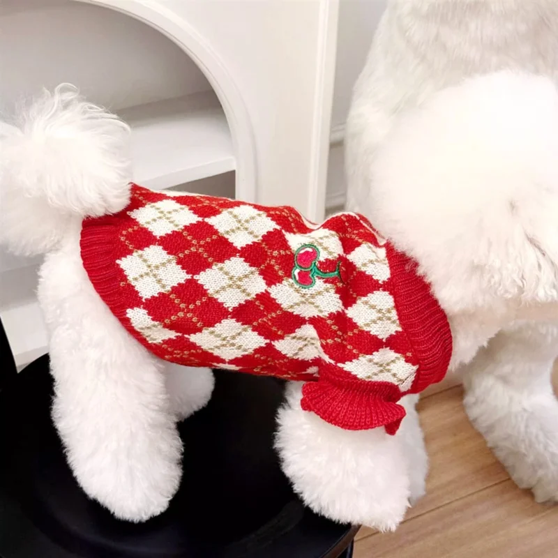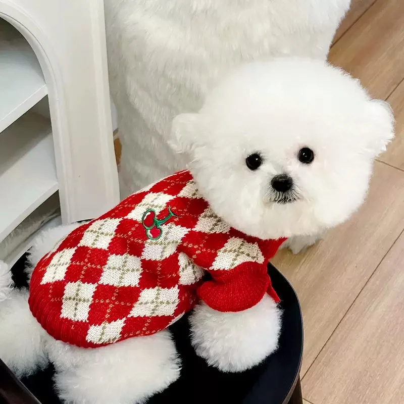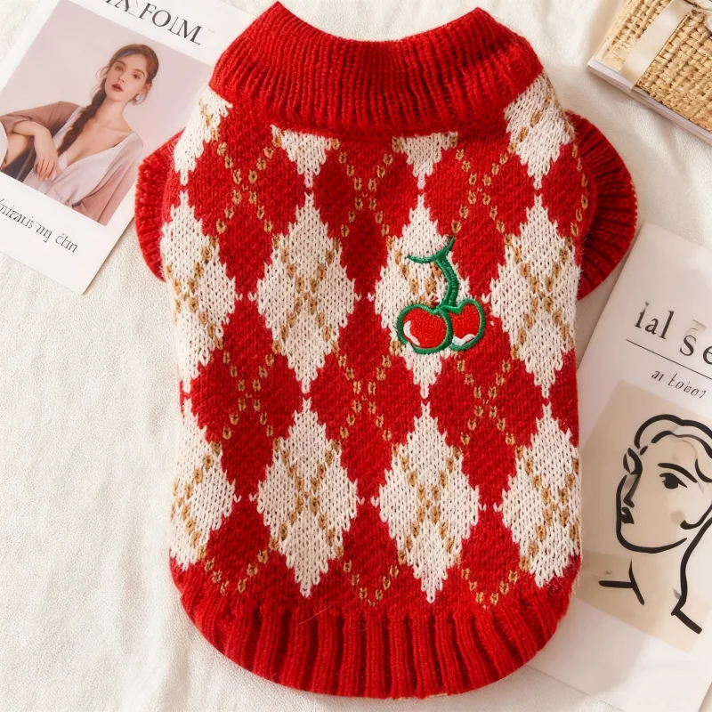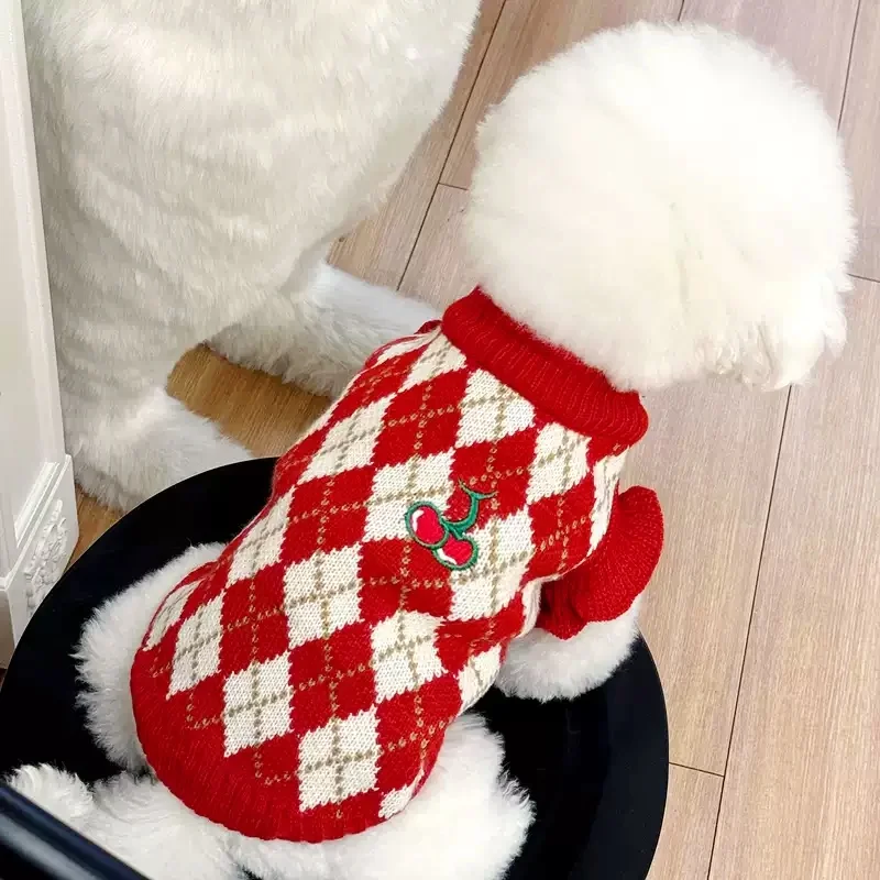 Suéter de punto para perro de invierno, ropa suave para perro, suéter bonito a cuadros para cachorros, jerseys para gatos con estampado de cerezas, ropa cálida para mascota con cuello alto y caniche