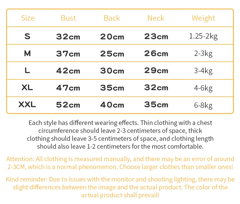 Tamaño: 2XL, longitud de espalda: 40cm/15,75 ", circunferencia del cuello: 35cm/13,78", busto: 52cm/20,47 ", peso recomendado: 6-8kg (aprox.)