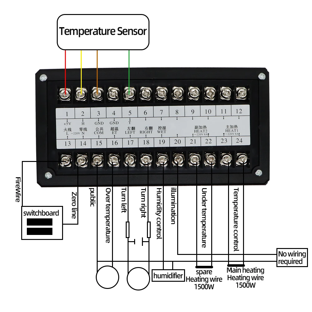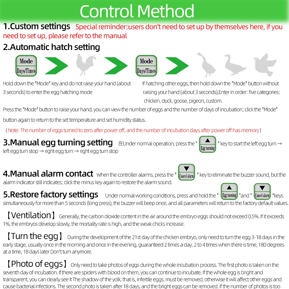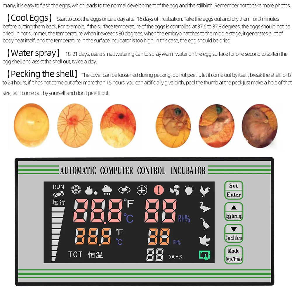 El controlador inteligente de incubadora de humitos de nueva generación es un sistema de control de microcomputadora totalmente inteligente diseñado y desarrollado para la industria de la incubación y iAplica la última tecnología microelectrónica y componentes de nuevo tipo.Maneja los chips de la microcomputadora para tener una fuerte antiinterferencia y un alto rendimiento estable;El sensor de temperatura aplica el sensor de alta precisión para tener una precisión de recolección de alta temperatura y un amplio rango de temperatura: aplica un sensor de humedad de alto rendimiento a alta precisión para garantizar eficazmente la estabilidad y confiabilidad.Tiene el diseño de cuatro pantallas fáciles de usar para visualización, incluidas dos pantallas que muestran la temperatura y la humedad de la incubadora y otras dos pantallas que muestran las horas de giro y los días de incubación del huevo presionando las teclas y mostrando la temperatura y humedad preestablecidas presionando las teclas.Y hay cinco tipos de modos de incubación para definición del usuario, pollo, pato, ganso y paloma disponibles para seleccionar.