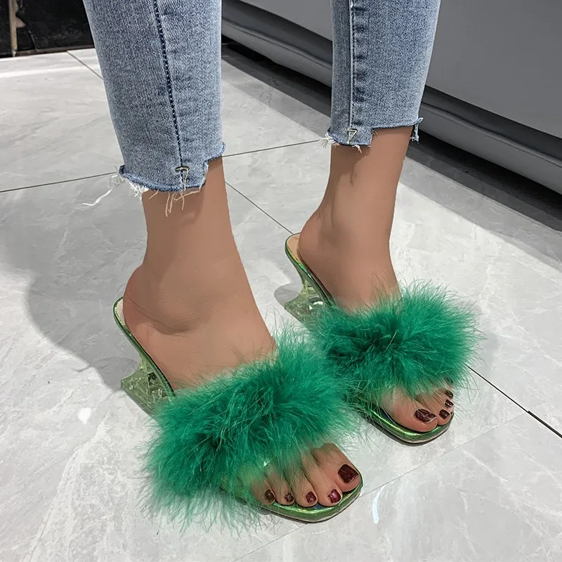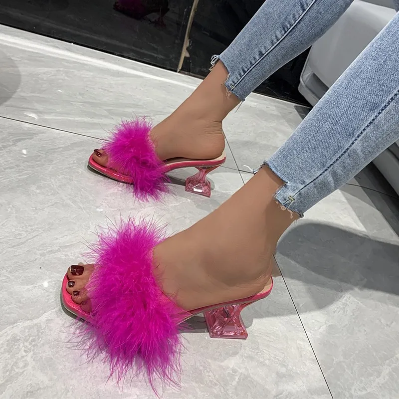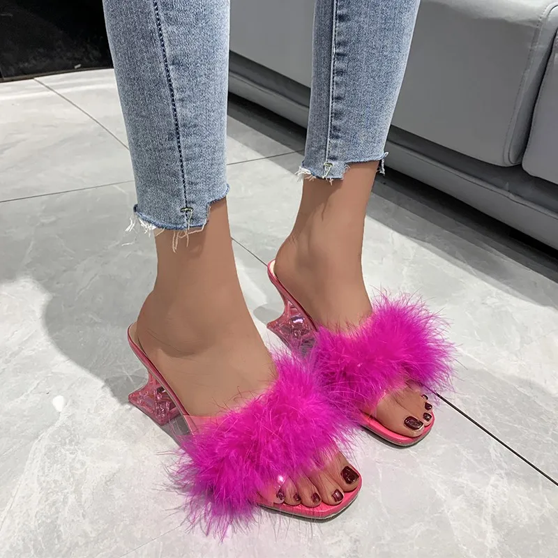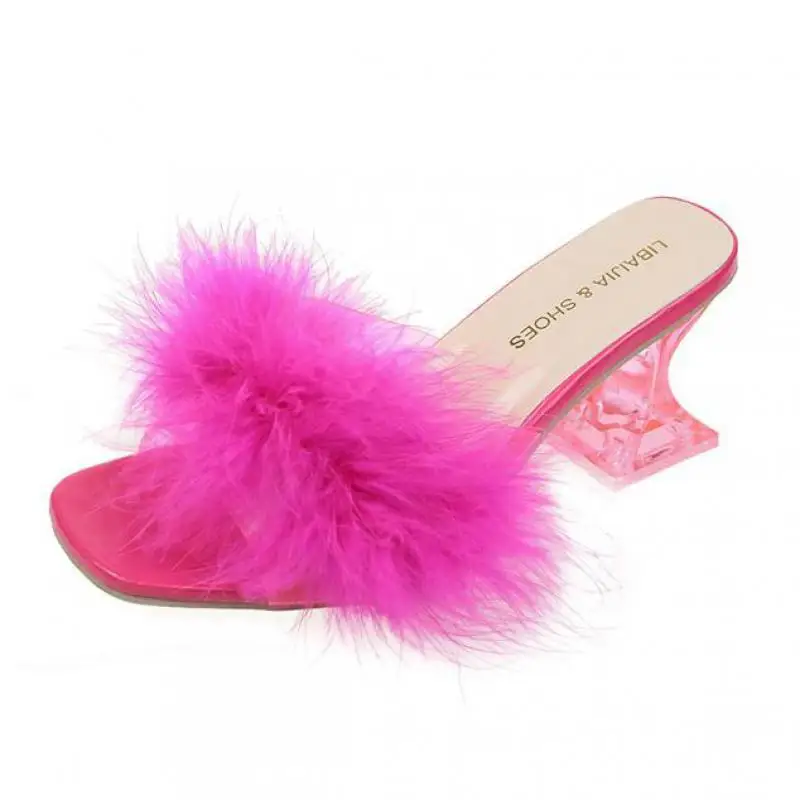 Ytmtloy-zapatos de tacón alto y esponjoso para mujer, Zapatillas de casa sin cordones de interior, con plumas de piel, 2022