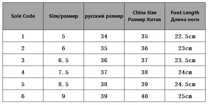 Código de suela 3=talla 6,5=longitud del pie 23,5 cm=ruso 36