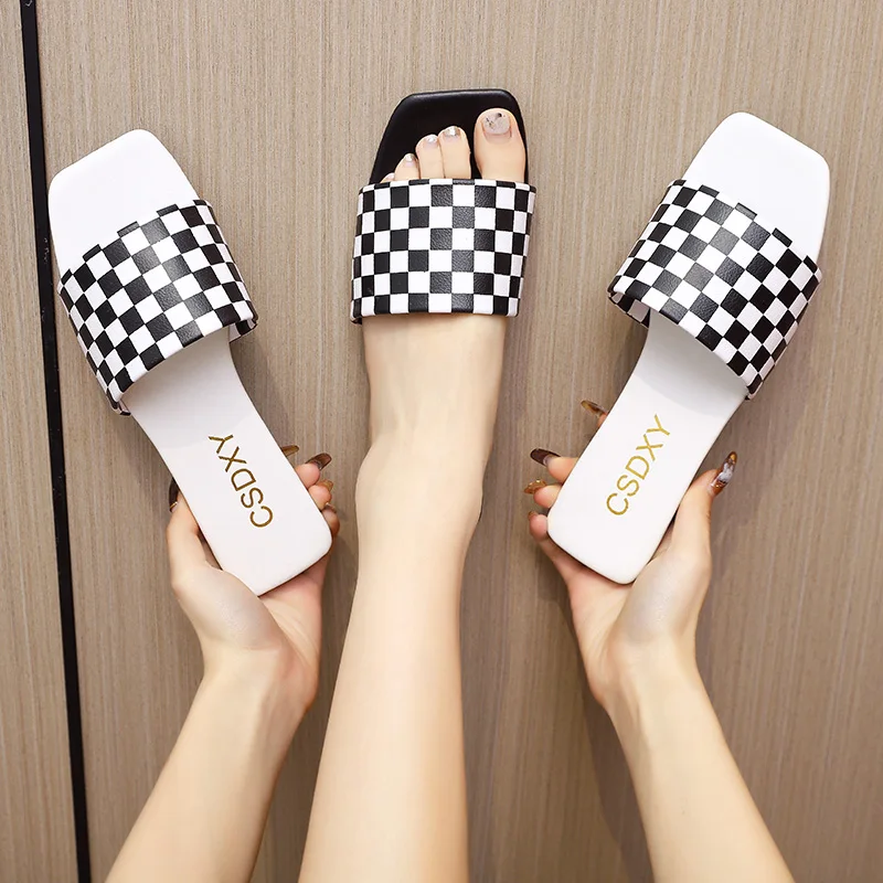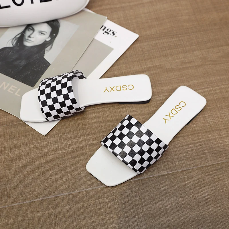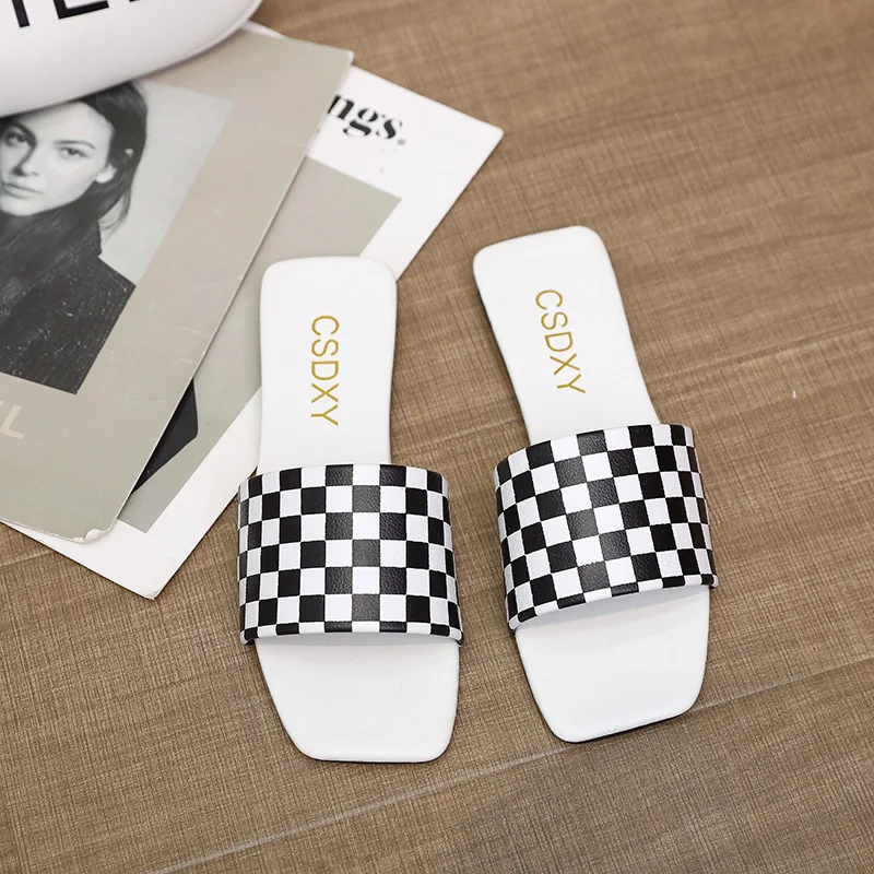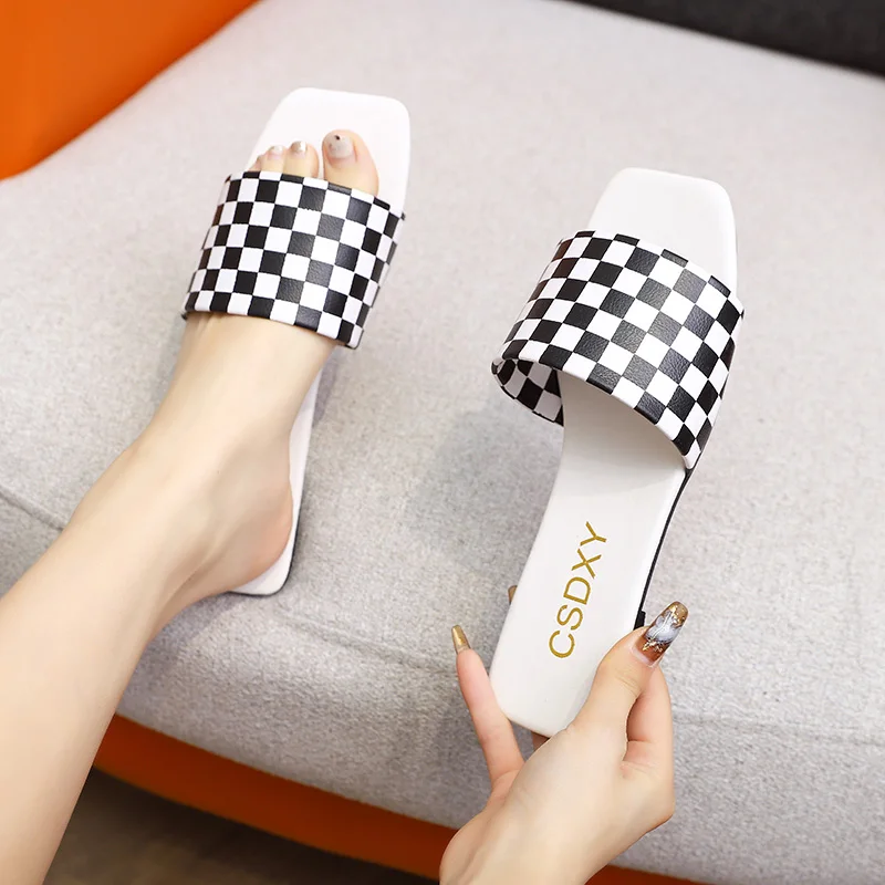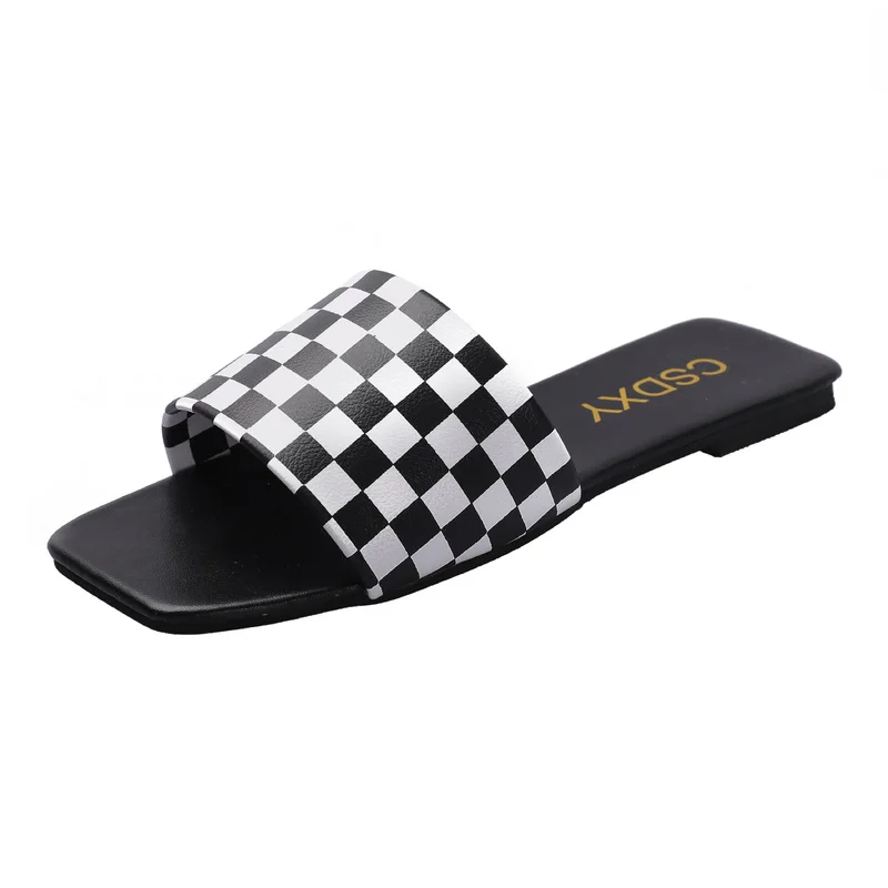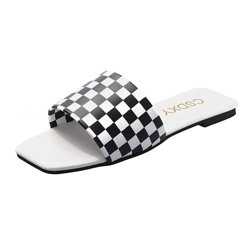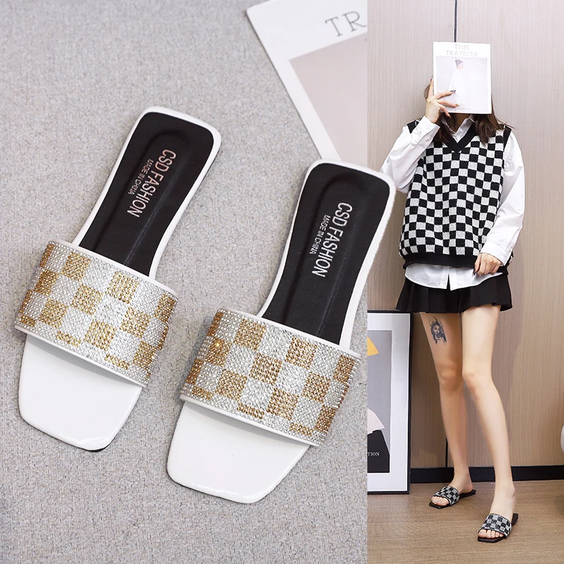 Zapatillas de tacón plano a cuadros para mujer, chanclas de diseño de lujo con diamantes de imitación, zapatos de talla grande, 2024