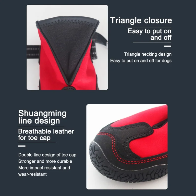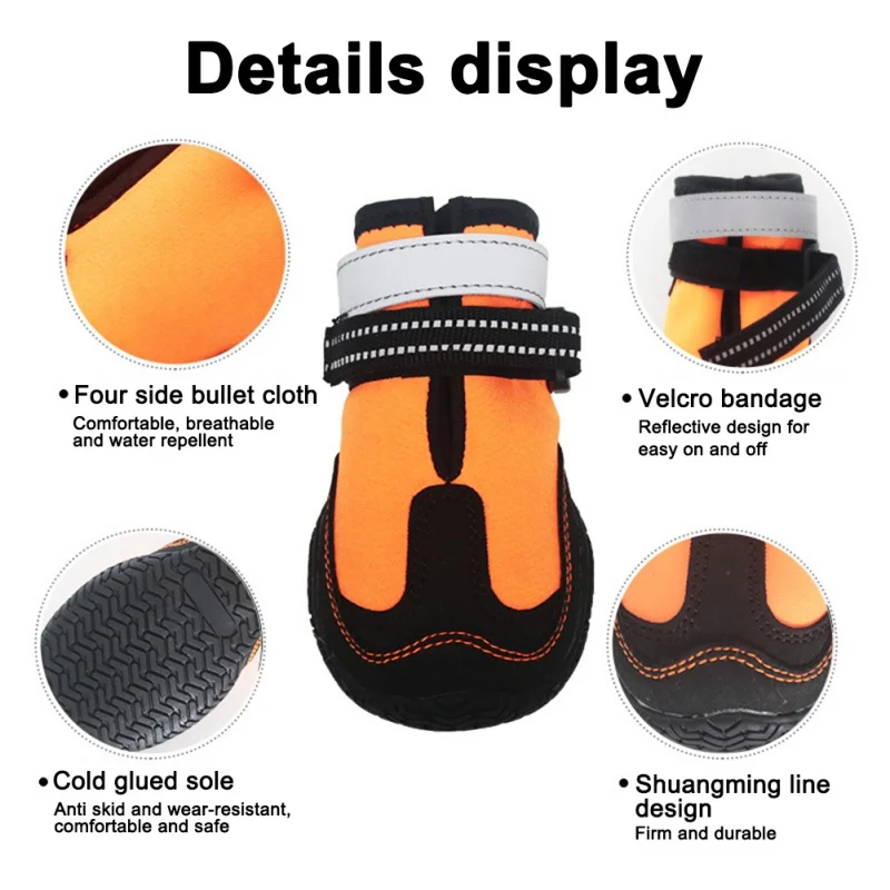 Material: nailon + cuero PU + Goma Color: naranja/Negro/rojo/verde Función: decoración, impermeable, antideslizante, cálido y resistente al desgaste Objeto aplicable: perro Tamaño: Tamaño ---- largo --------- ancho ----------- peso 1 #-6,5 cm/2,26 "---4,0 cm/1,57" -- - 7kg perros dentro de 2 #-7,0 cm/2,76 "---4,5 cm/1,77" ---perros dentro de 10kg (9kg oso Schnauzer) 3 #-7,5 cm/2,95 "---5,0 cm/1,97" -- Samo de tamaño mediano, husky, Labrador, pino mediano y grande 4 #-8,0 cm/3,15 "---5,5 cm/2,17" ---Utensilios dentro de 12,5 kg 5 #-8,5 cm/3,35 "---6,0 cm/2,36" -- perro pastor, Cocker, pino mediano 6 # --- 9,0 cm/3,54 "---- 6,5 cm/2,56" ---- Samo medio, husky, Labrador 7 #-9,5 cm/3,74 "---7,0 cm/2,76" ---medio dorado, más grande, Samo, Demu, Labrador 8 #-10cm/3,94 "---7,5 cm/2,95" -- pelo dorado grande, Demu, rowina, Alaska mediano y grande Características: 1.Material: tela + cuero PU + Goma. No daña los pies de la mascota. La tela de lana interior mantiene a tu perro caliente. 2. Calidad: la PU reflectante garantiza una buena visibilidad, especialmente por la noche en la carretera. 3. Conveniencia: pasta de doble cara, fácil de usar pero no fácil de caer. Zapatos con abertura ancha y dos correas ajustables de pasta y de doble cara para garantizar un ajuste ajustado 4. Resistente: las botas para perros y los protectores de patas para perros son suaves, y la suela de goma antideslizante proporciona estabilidad y tracción. Ayuda a la movilidad y estabilidad del perro en carreteras con azulejos y arena en espinas incisivas y carreteras calientes. 5. Fácil de poner y quitar: este zapato para perro tiene una gran hendidura y dos correas reflectantes ajustables para garantizar la estanqueidad del zapato y mantener al perro seguro por la noche. 6. Zapatos antideslizantes: El desgaste de la pata puede proteger contra espinas incisivas y pavimento caliente. Protege eficazmente las garras de los perros del calor, piedras, vidrio, etc. Protege la pata débil de la nieve, el hielo, la sal durante el invierno. Medición: Sube a tu perro y pon tu pata en un trozo de papel blanco. La longitud va desde la uña del pie más larga hasta la parte posterior de la garra. Para el marcador de ancho, la garra más ancha es de izquierda a derecha. Mida el ancho de la garra para un mejor ajuste. Consulta la tabla de tallas y el tamaño real de tus botas de mascota y Elige el tamaño más adecuado para tu perro. El paquete incluye: 1 x bota para perro (4 piezas/lote) Notas: 1. Permita una diferencia de 1-3 cm debido a la medición manual y 3-5g para la diferencia entre diferentes colores. 2. Debido a la diferencia de pantalla, el color puede ser un poco diferente al que usted espera, por favor permítalo. 3. 1,00 cm=0,39"