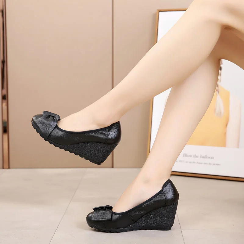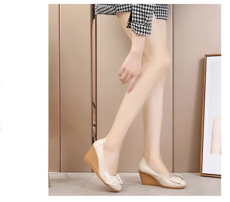 Zapatos de cuña de cuero genuino para mujer, tacones altos de 7cm, elegantes, color negro puro, Beige, suaves y cómodos