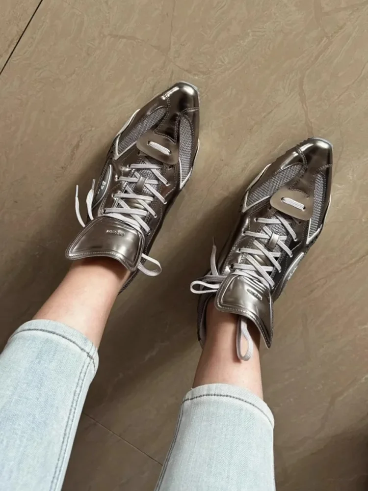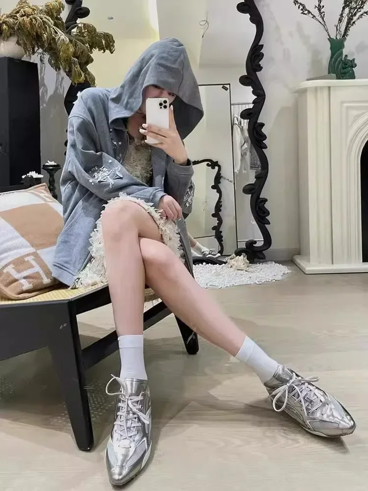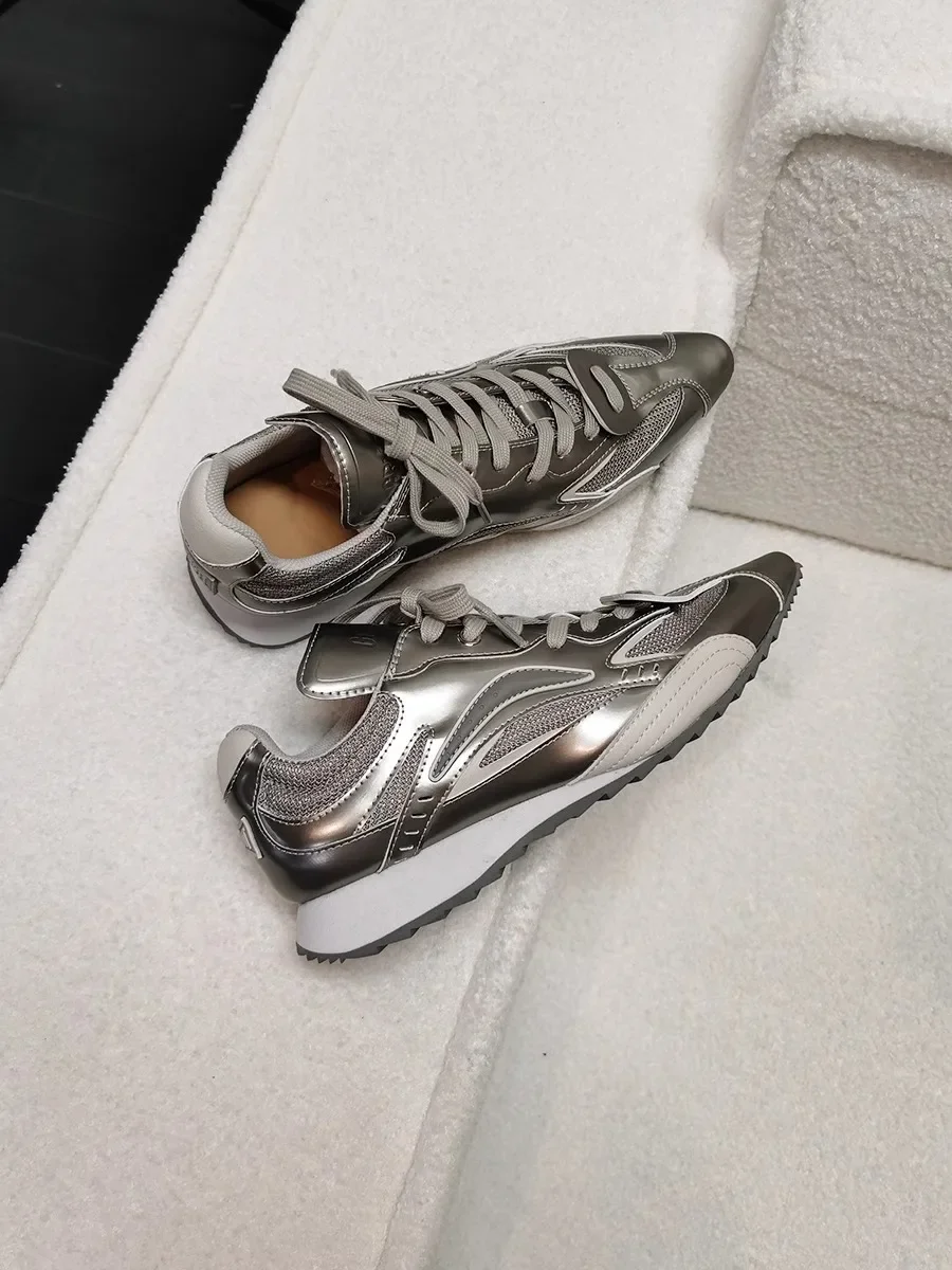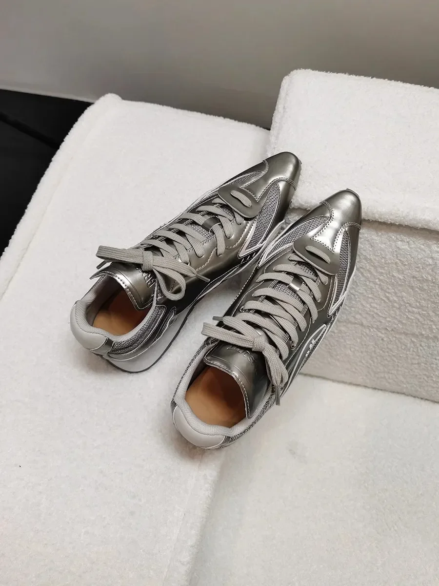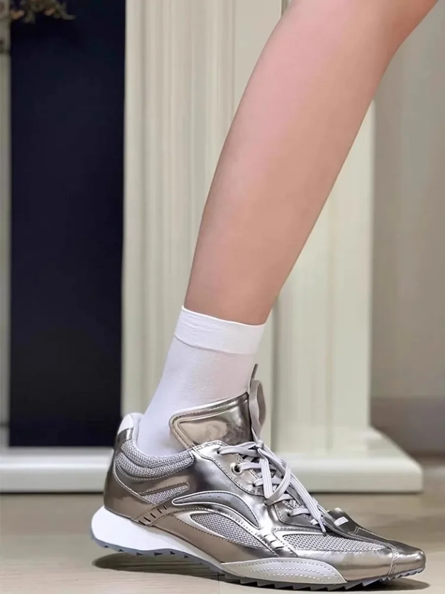 Zapatos deportivos de punta estrecha a la moda, aumento de hilo dorado y plateado, nuevo diseño de público pequeño para mujeres adultas, zapatos informales de verano