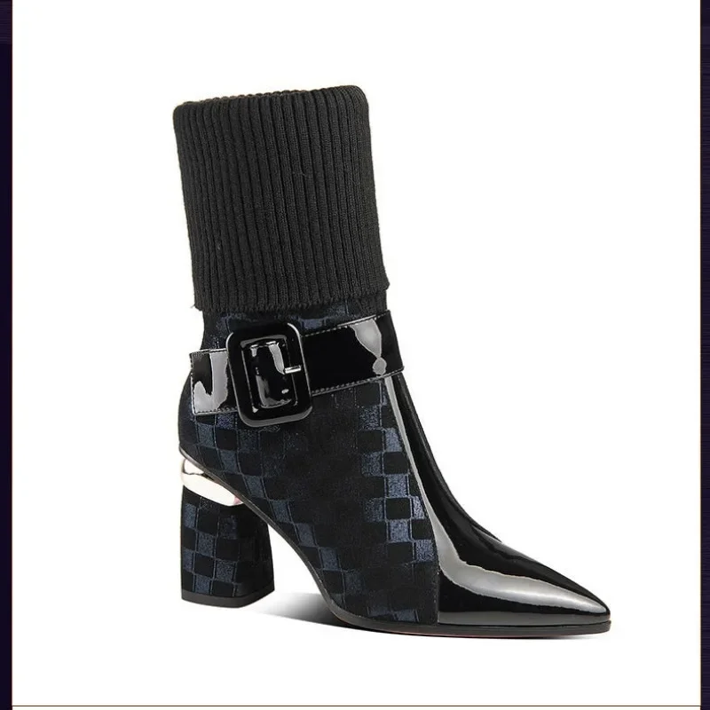 Zapatos de mujer 2024, nuevo estilo, botas de mujer de tela elástica de tacón grueso, nuevas botas de invierno con punta estrecha y cremallera, botas de tacón alto a la moda para mujer