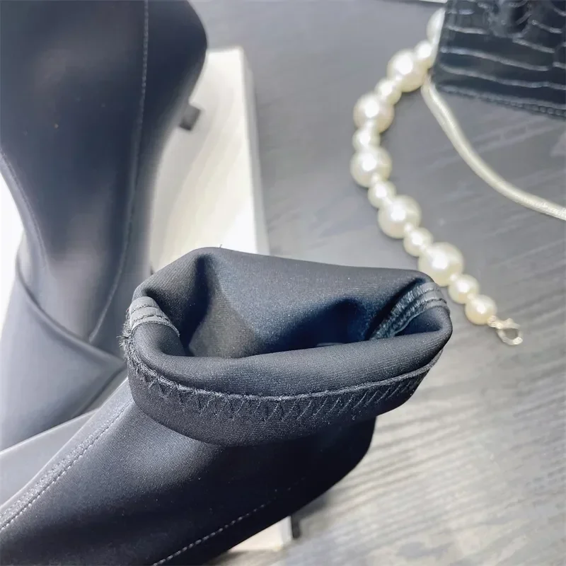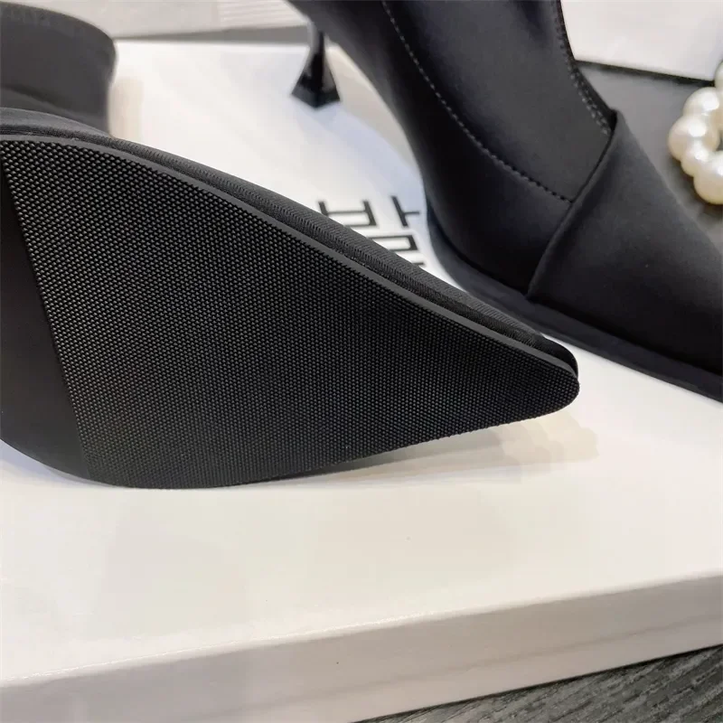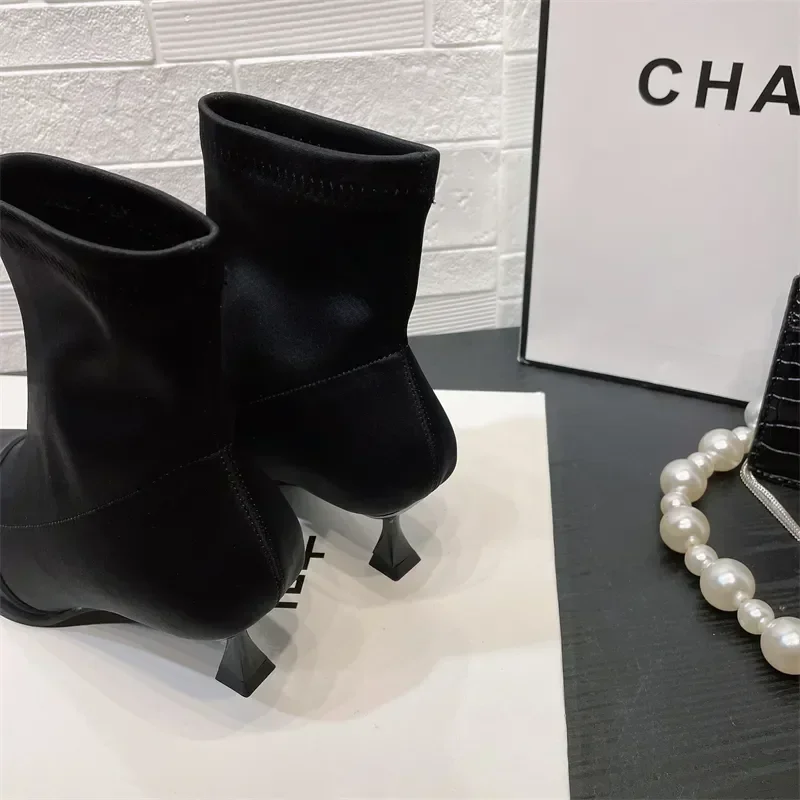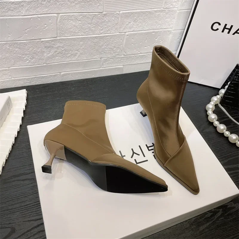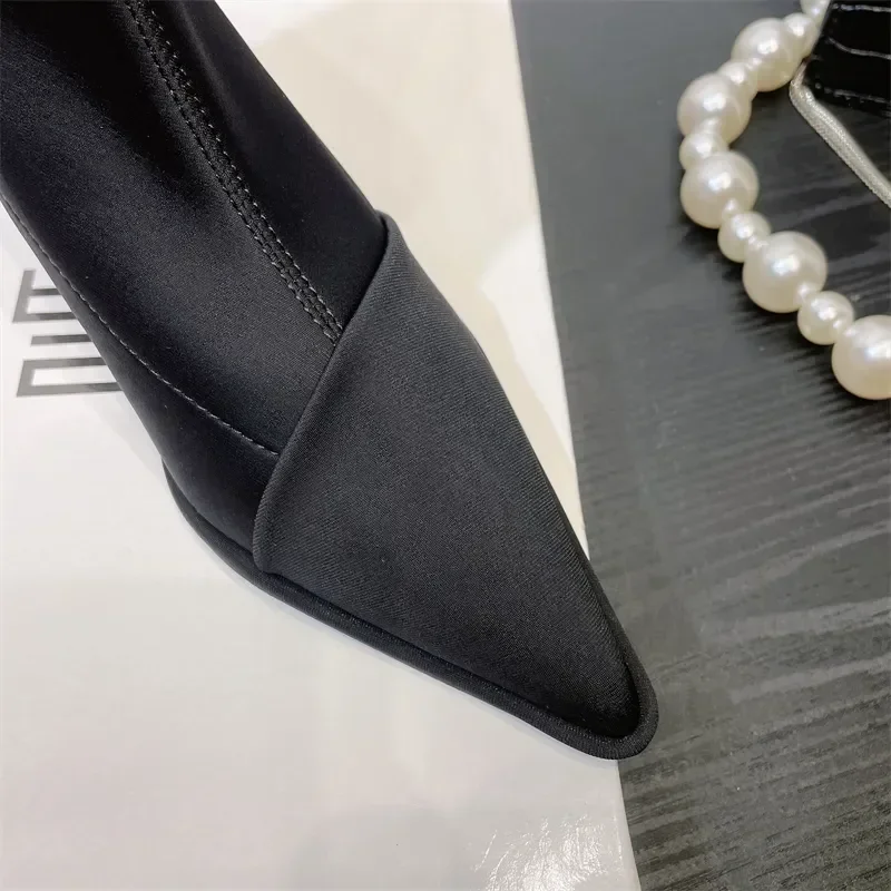 Zapatos de mujer elegantes de tacón alto y fino, nuevas botas cortas de satén con punta estrecha, botines elásticos con temperamento, elegancia corta