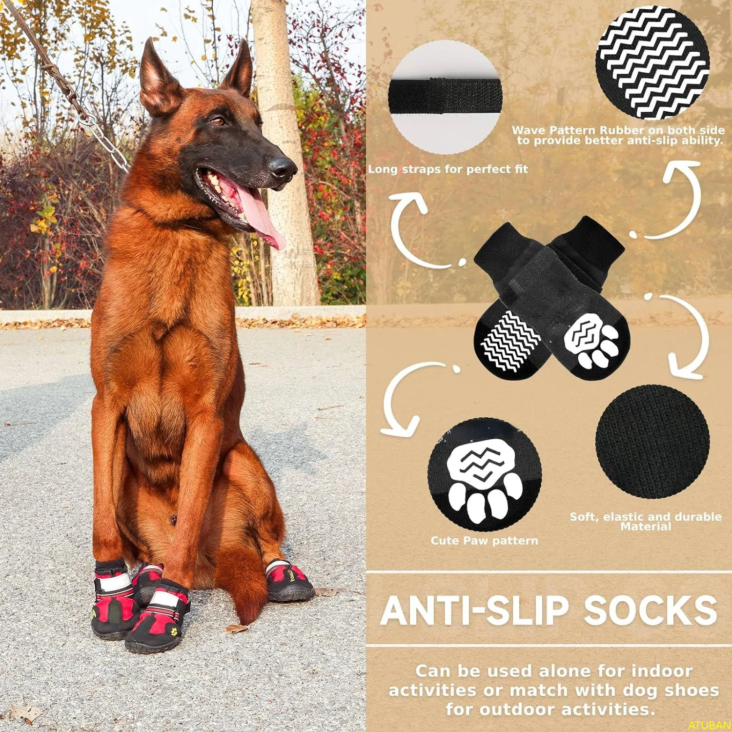 [Diseño antideslizante integral]: La suela del zapato está hecha de material de goma suave, lo que garantiza una estabilidad y un agarre robustos para sus perros, evitando resbalones y posibles lesiones. El empeine del zapato, hecho con tela de spandex, ofrece alta elasticidad y protección robusta. Si tiene el problema de que los zapatos se caigan, considere usar NUESTROS Calcetines antideslizantes junto con las botas. Los calcetines están fabricados con algodón de calidad para garantizar la comodidad de su perro durante mucho tiempo