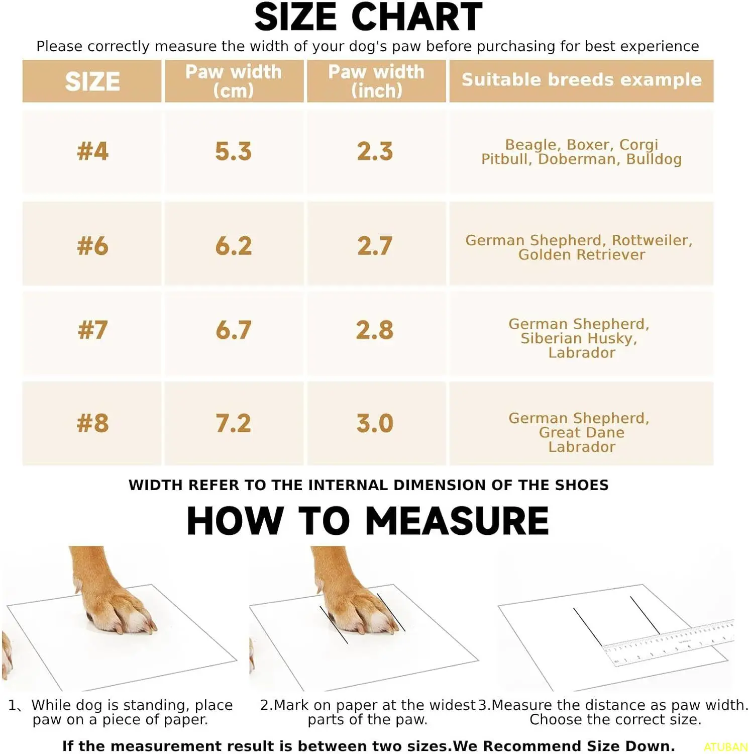 [Selección de tamaño (LEA CUIDADOSAMENTE)]: Recomendamos encarecidamente medir el ancho de la pata de su perro de acuerdo con las instrucciones y hacer referencia a la tabla de tallas para seleccionar el tamaño adecuado para el mejor ajuste. TAMAÑO BAJO si el ancho de la pata está entre dos tamaños. Es posible que algunos perros tengan anchos significativamente diferentes entre sus patas delanteras y traseras, lo que puede requerir elegir diferentes tamaños de zapatos en función de los resultados de la medición. No dude en contactarnos. Responderemos en 24 horas