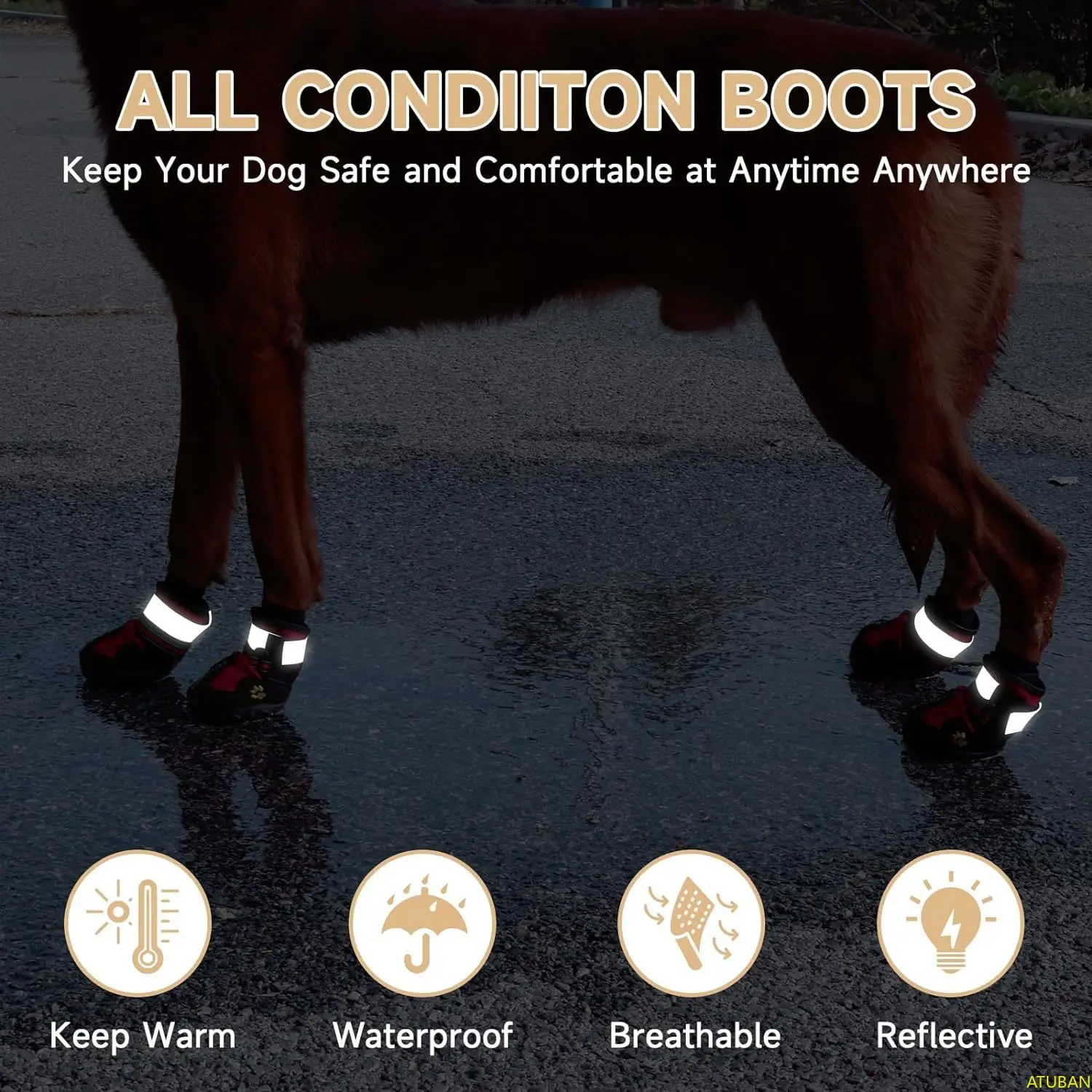 [Seguro, ajustable y seguro]: estos zapatos para perros cuentan con una amplia apertura para facilitar la puesta y la retirada. Las correas dobles ajustables y reflectantes están diseñadas para evitar que los zapatos se resbalen y para mantener a su perro visible y seguro durante los paseos nocturnos.
