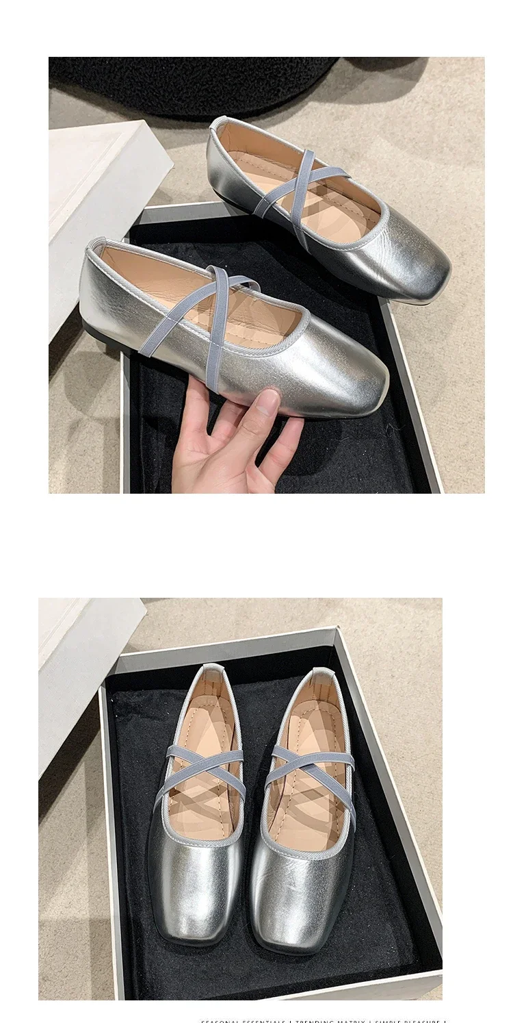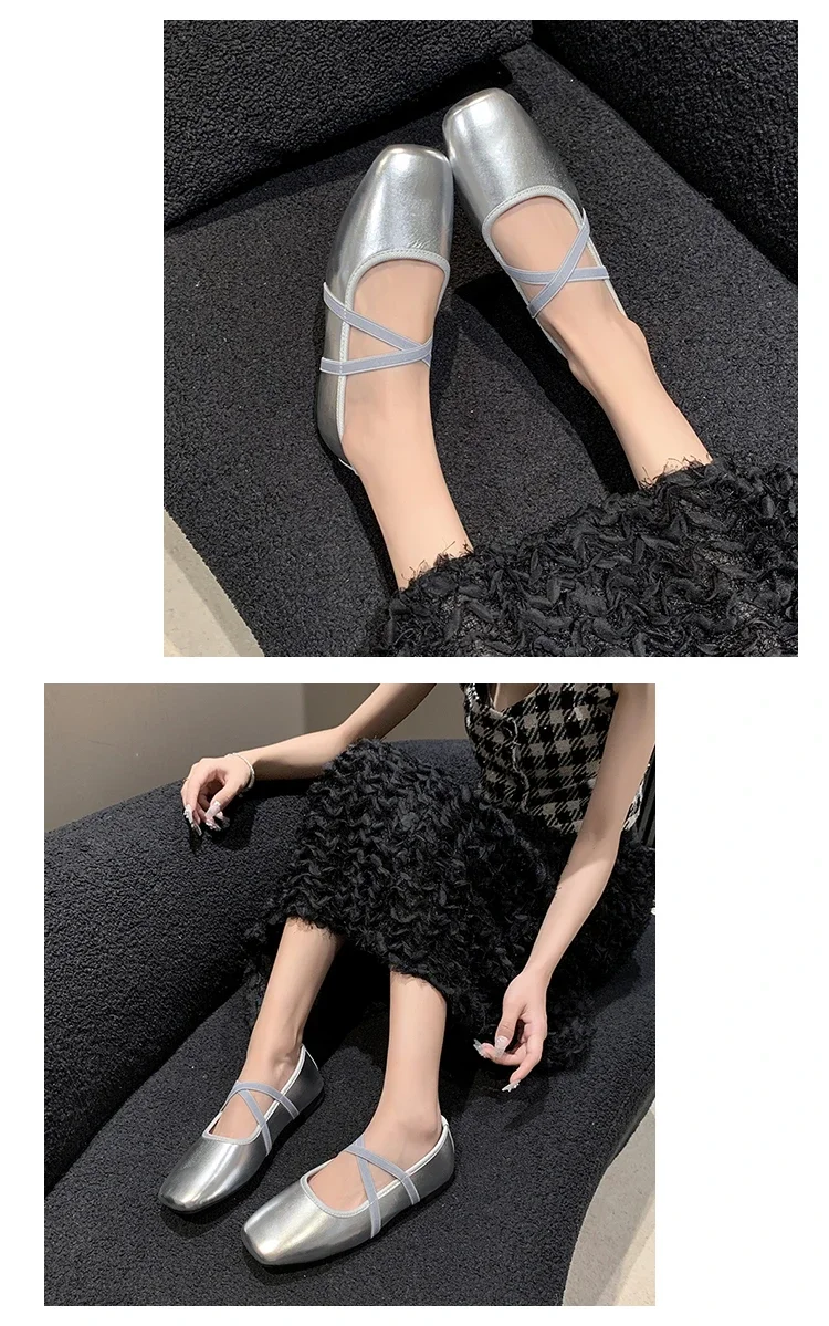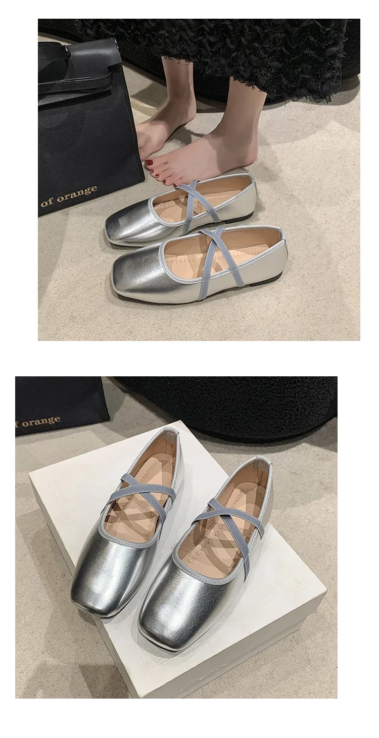 Zapatos planos con pajarita plateada brillante para mujer, mocasines de cuero a cuadros con punta redonda y retales, zapatos planos para mujer