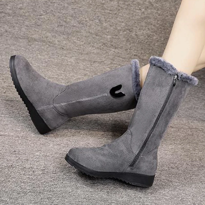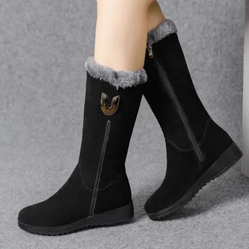 Zapatos de plataforma para mujer, botas de nieve con cremallera lateral para invierno, punta redonda, forro polar de felpa para el calor, botas de nieve planas de tubo alto sólido