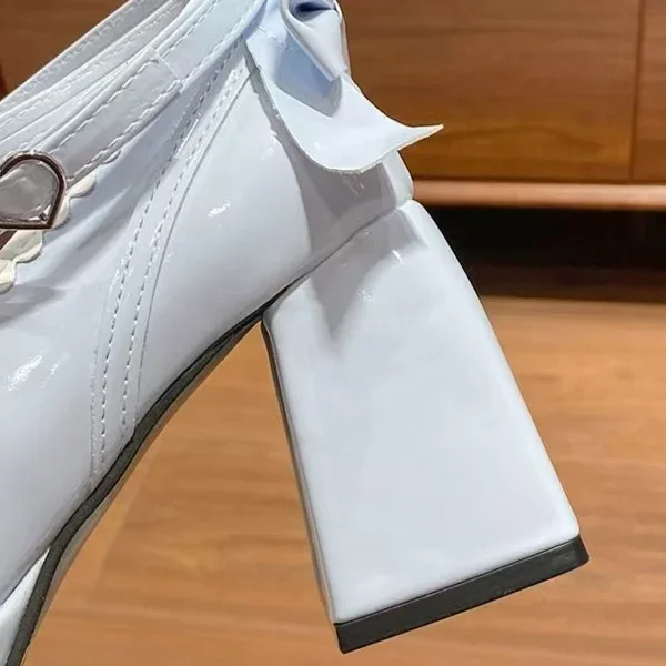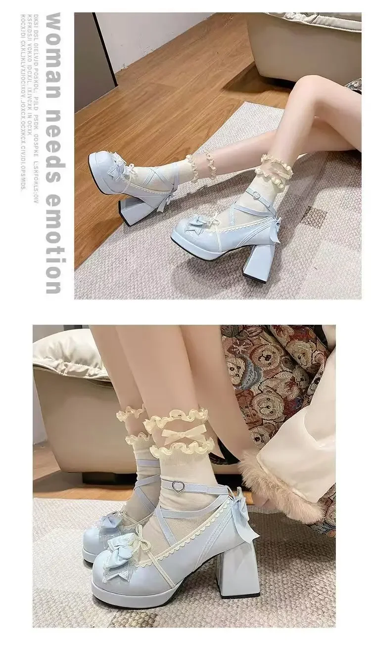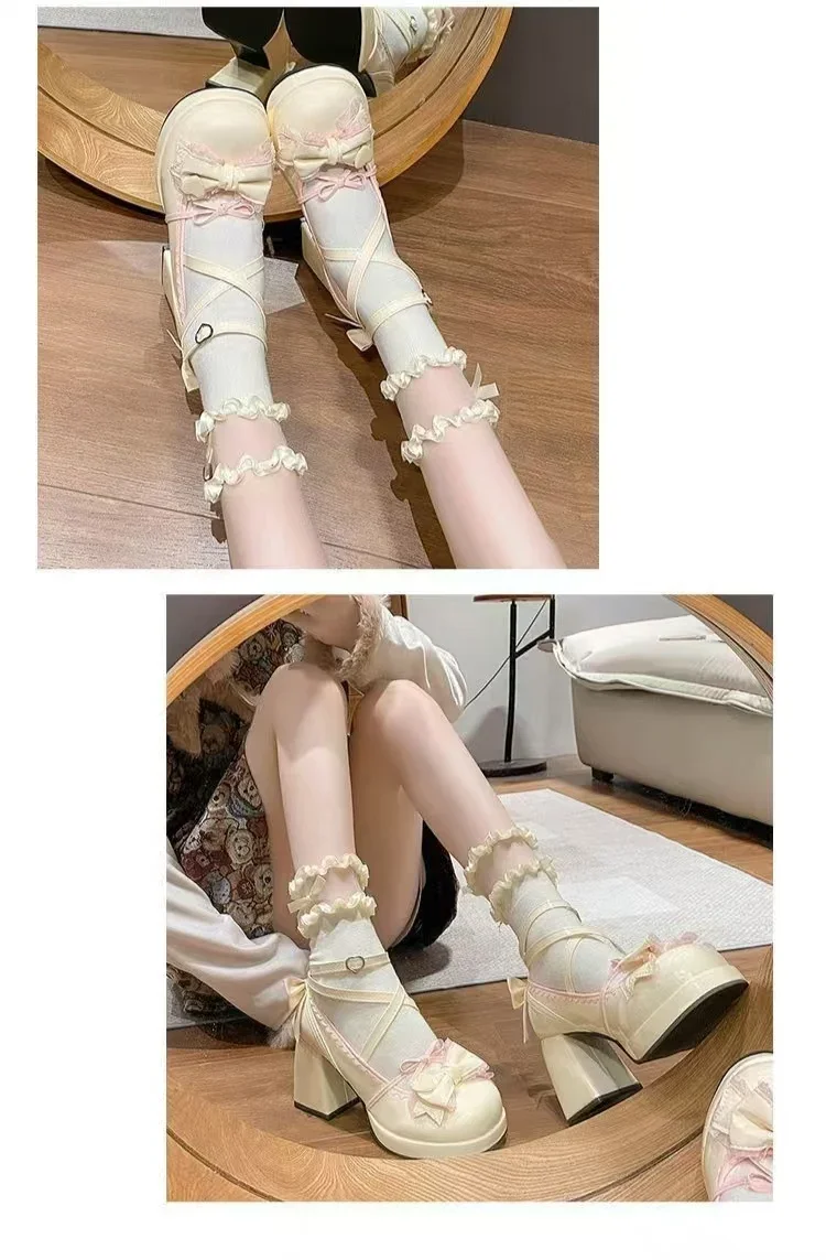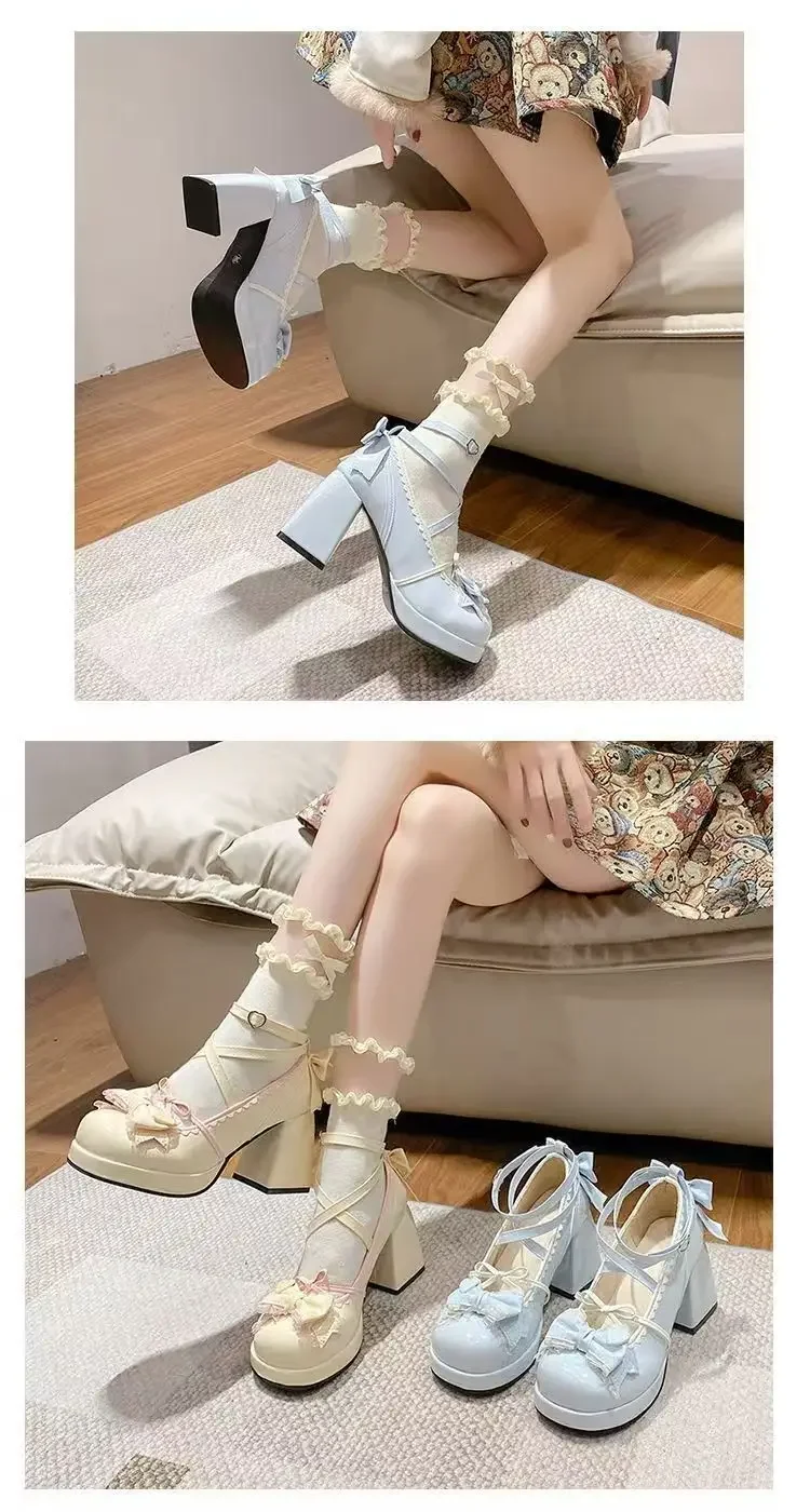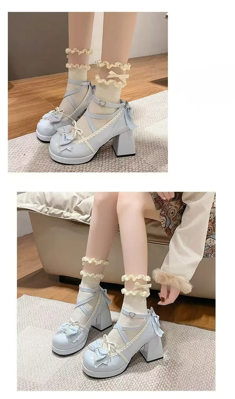 Zapatos de tacón alto con correa cruzada para mujer, zapatos de tacón Mary Jane para fiesta, boda, Cosplay, lazo azul Beige, princesa, Cosplay, Lolita, 2025