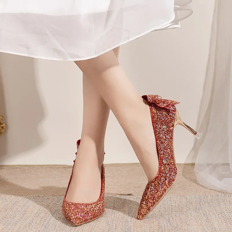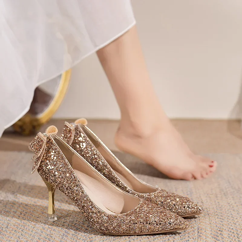 Zapatos de tacón de lujo con lentejuelas doradas y plateadas para mujer, zapatos de tacón alto sin cordones para fiesta y boda, zapatos de tacón fino con punta estrecha 2024
